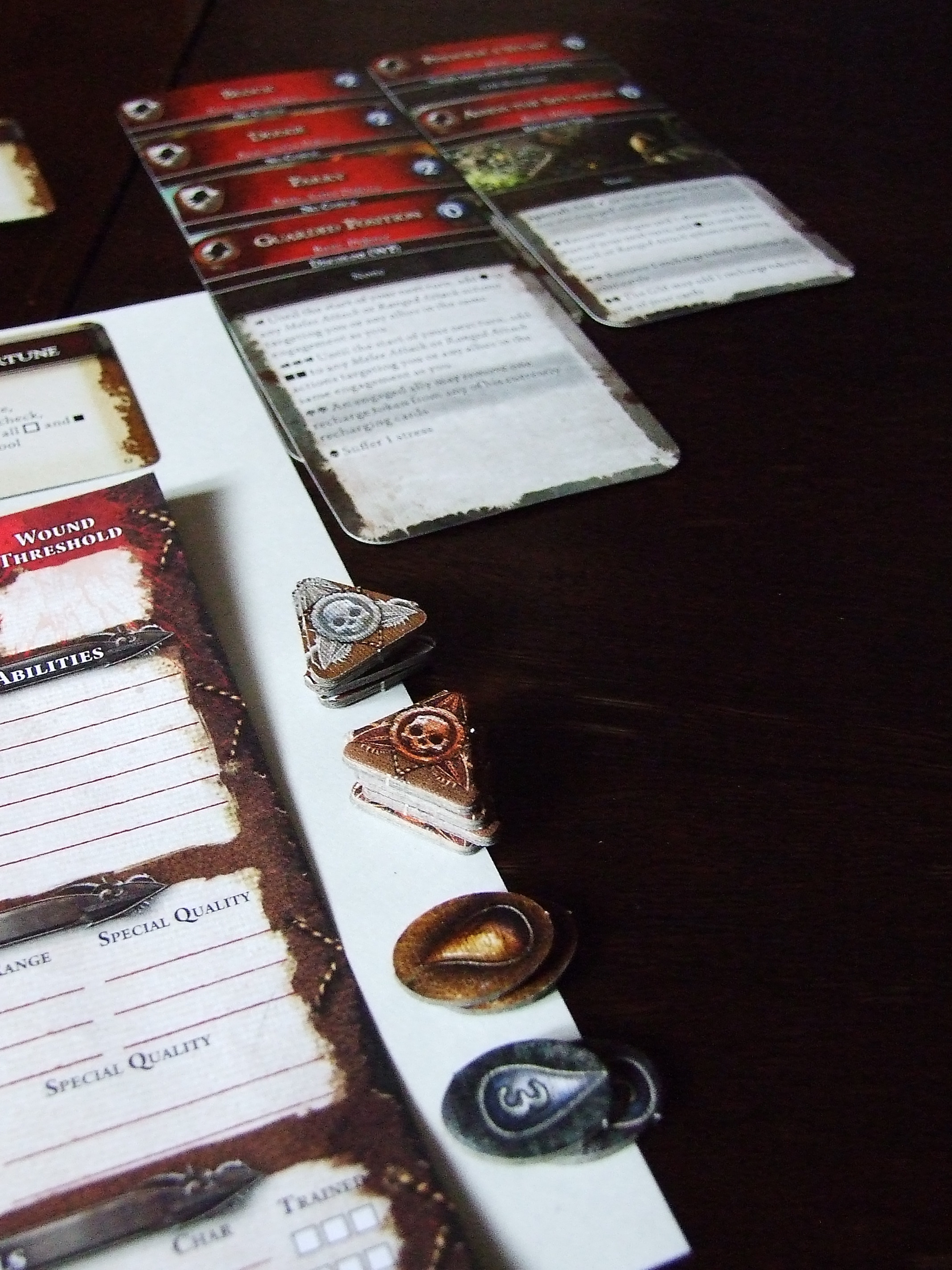 カウンターの上にはアクションカードです。アクションカードはキャラクターの普通・異常なできる行動の説明をあらわす。皆さんは基本アクションカードを(攻撃や受け流しなど)が集められるが、その上にキャラクター作成の時に1から4枚を決めて加えることもできる。以下はアクションカードの写真: