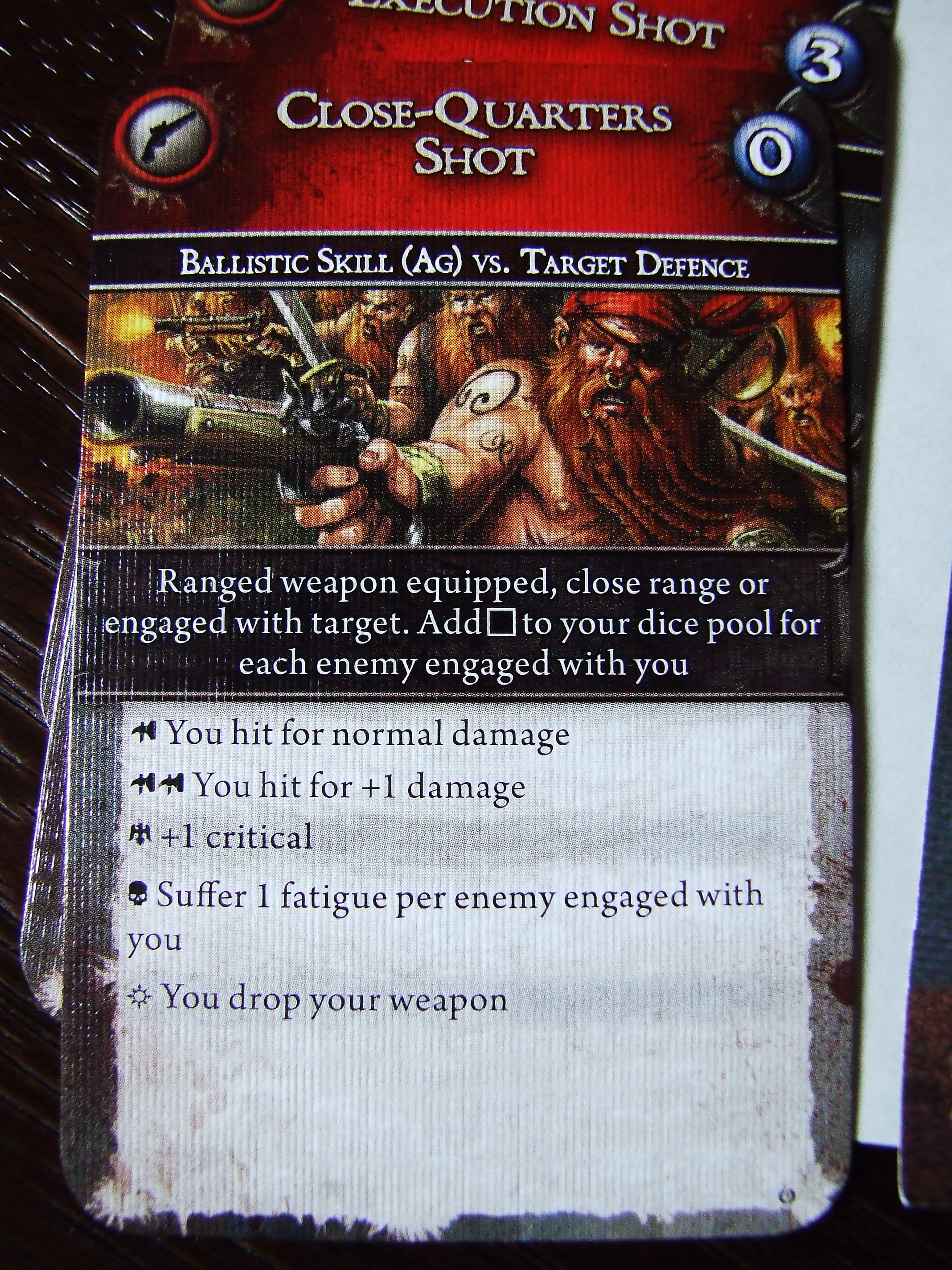 - 熟練サイコロ:黄色のd6。もしアクション関連技能は熟練があったら、このダイスをダイスプールに加える。例えば、近距離射撃の関連熟練はBallistic Skill(射撃技能)。私の例のキャラクターはこの技能を1レベルに熟練があるから、熟練ダイス1個をダイスプールに加えられる。熟練最高レベルは3