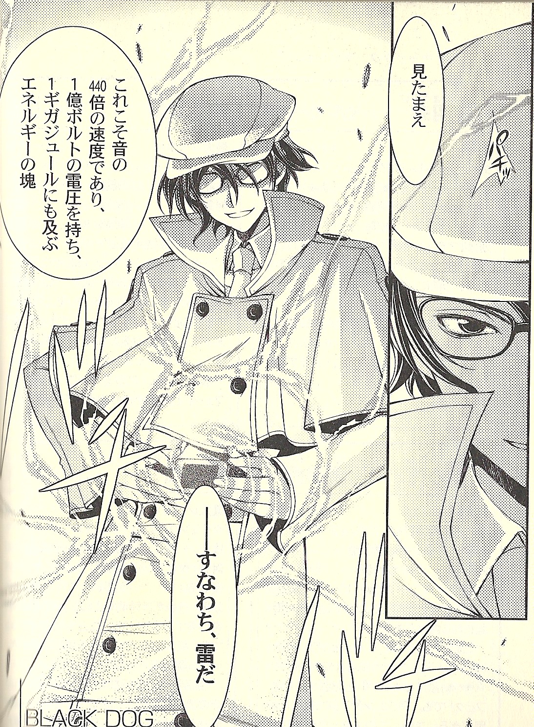 The image is from the Black Dog chapter of the Double Cross rulebook. The inset panel says “before you look,” and the main panel says something like, “A bolt of energy that is surely 440 times the speed of sound, a million volts of power, and as much as a gigajoule of energy… that is to say, LIGHTNING.”