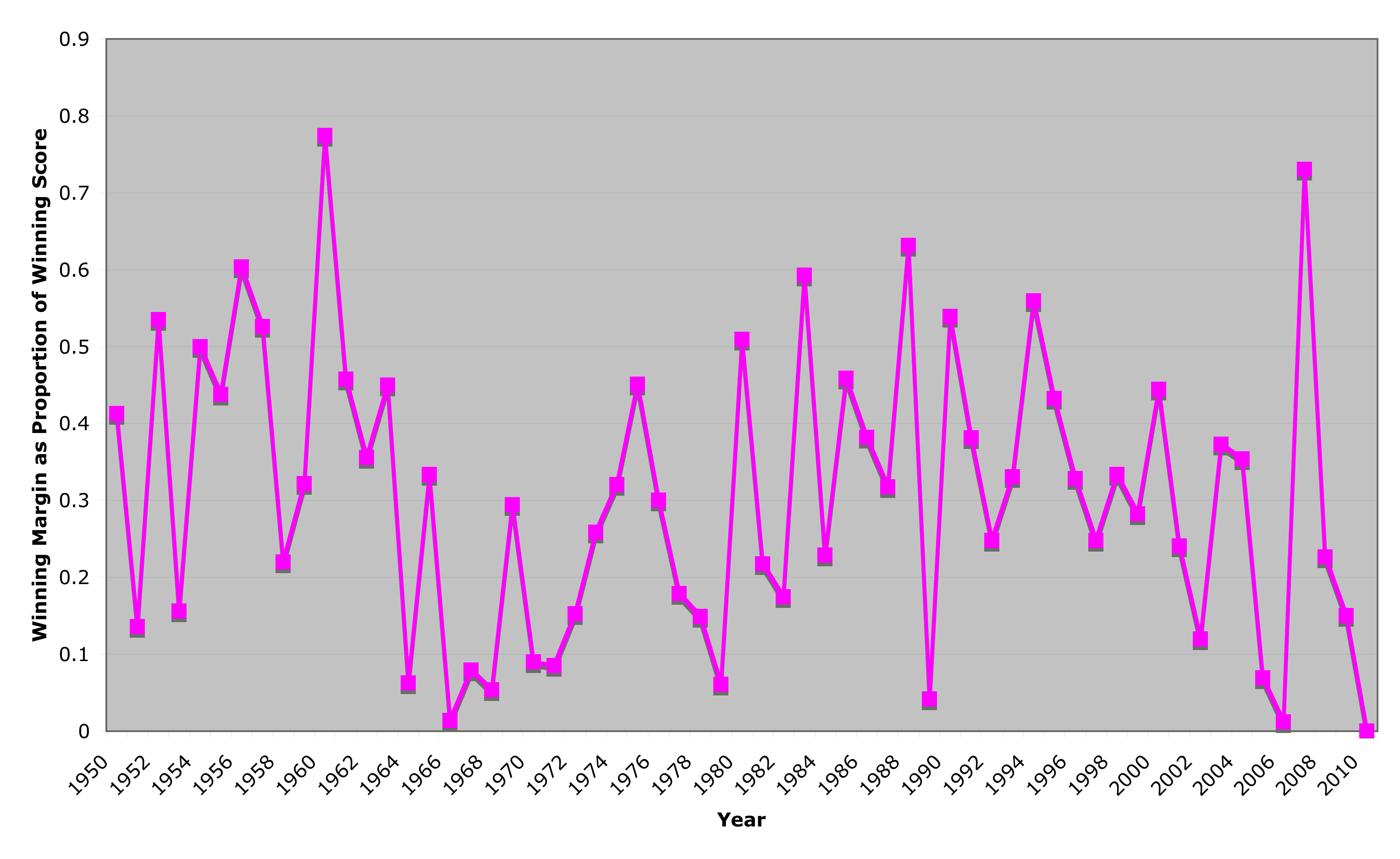 Winning and losing scores since 1950 were provided by the author of the post at Larvatus Prodeo (I rather suspect he’s been writing them by hand on the day of the final since 1950, but let’s assume they’re accurate because no AFL fan would get something as important as this wrong). Visual inspection was used to investigate the possibility of a narrowing of winning and losing scores. The margin of victory was divided by the winning score to give a measure of the proportionate margin (referred to as such from now on) and ARIMA time series analysis used to estimate the seasonal patterns (if any) in the proportionate margin. A linear model was then fitted to the proportionate margin by year, and serial dependence in the residuals estimated using another ARIMA model. Where serial dependence was evident, a second linear model was fitted using generalized least squares adjusted for the identified serial dependence, and the resulting estimates of the straight line fit were presented.