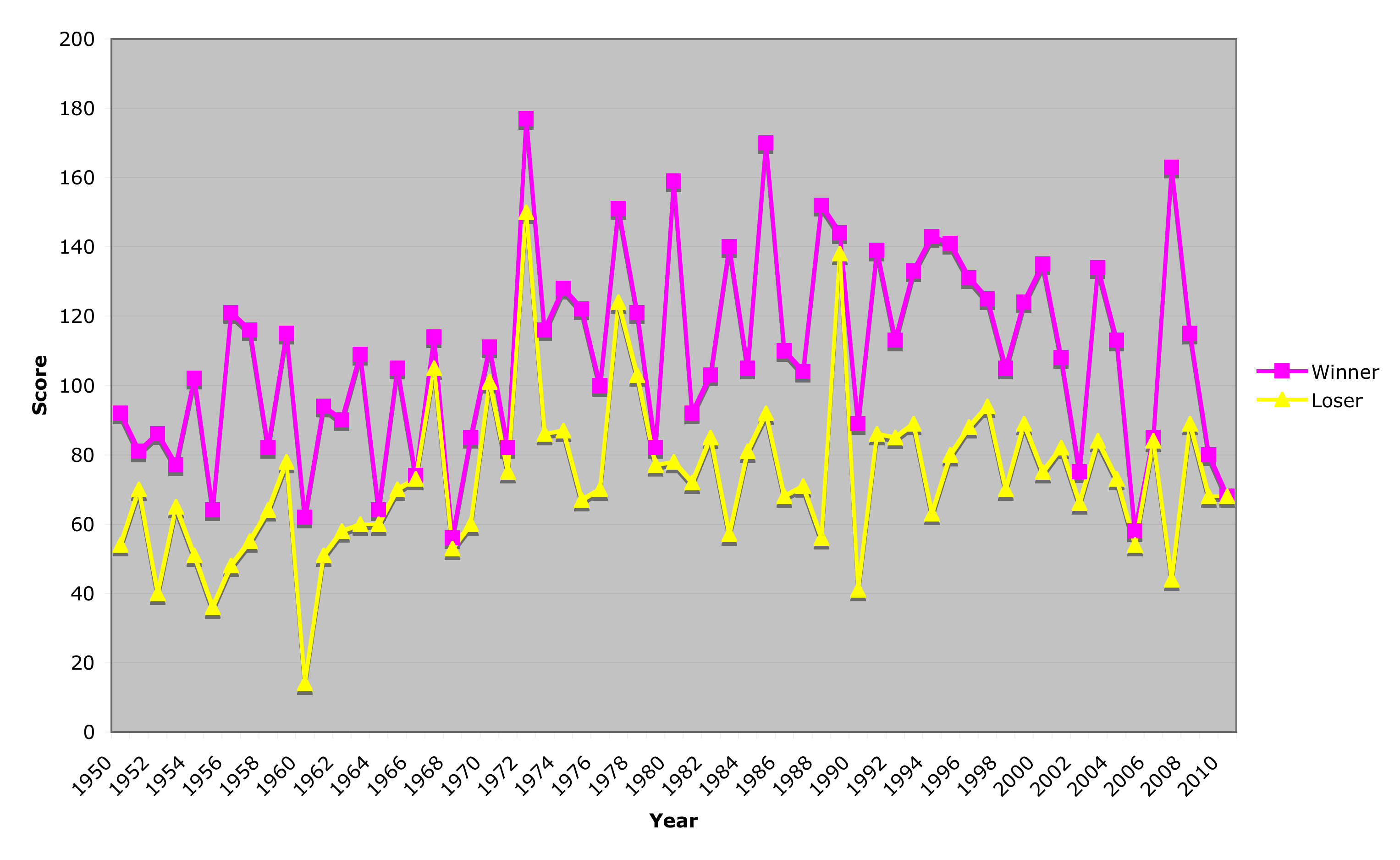 Figure 1 shows the winning and losing scores in the grand final for the last 60 years. There appears to be a narrowing of scores before the 1980s and another narrowing the previous 10 years, though the results shown in this chart are hardly conclusive. There’s also a hint of a jump in scores at about 1980, which actually shows up very clearly in the differenced time series plot of loser scores but not of winners.