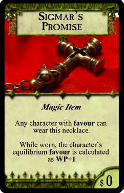 In exchange for the picture she gave each character a letter granting them a single free visit to the Shrine of Shallya (for healing), and a magic item called “Sigmar’s Promise,” a necklace of a platinum hammer that can be worn by any initiate of any religious church, and which grants the initiate +1 Willpower for the purposes of calculating their equilibrium state of favour while worn. Obviously Suzette took this item.