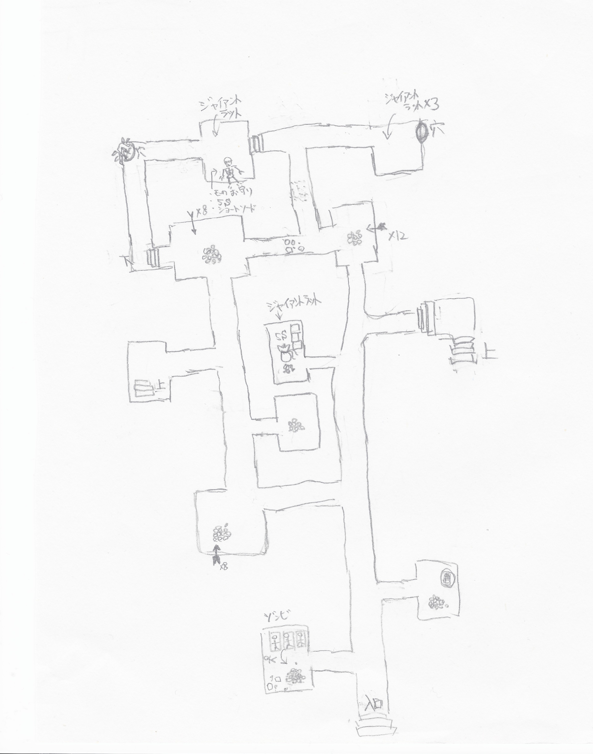 This picture is a scan of the map my players drew during their latest session, when they entered the wizard’s tomb. A classic dungeon map, but done in Japanese, with rats in silhouette and of course, typical honorifics – “Honourable Talisman of Morr” is written in very small letters near the top of the map, for example. Notice as well that the location of the Giant Rats is noted, but due to the pernicious influence of D&D, they are noted as “Gianto Ratto” rather than the Japanese term, which is “kyodai nezumi.” I think Gianto Ratto sounds very cute.