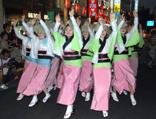 On Friday night I attended the Kagurazaka Festival in Idabashi, Tokyo. In this famous festival, groups of performers dance their way around a course through the streets of a famous part of old Tokyo; the most significant part occurs on the famous “Kagura Slope” to a backdrop of drumming and Japanese pipes. The procession alternates between groups of men carrying lanterns, and groups of women in the outfits shown above, whose dance primarily consists of movement of their hands and a strange, shuffling walk on the tips of their geta shoes – an extraordinarily difficult dance to maintain for two hours, especially given the oppressive heat of this season. The crowd of onlookers is drunk down to the last tottering young lady, and the dancers are carnivalesque, leaping on members of the crowd in a group or giving lewd and suggestive movements to admirers in the crowd. At times the women draw up into a phalanx such as the one pictured, and the men dance around them; or the women themselves suddenly surge forward to wave their hands at the crowd. The rhythm and style of the dance can be viewed here, and some interesting pictures here. As ever with Japanese drumming, the full force of the drums are not captured in amateur film. A slightly more professional depiction of the same dance from the seventies can be viewed at the 10’05” mark of the movie Sans Soleil, which is viewable here. Notice how in the first video the dancing girls bunch together into a tight phalanx of kimono, pointed hats and arcane hand movements.