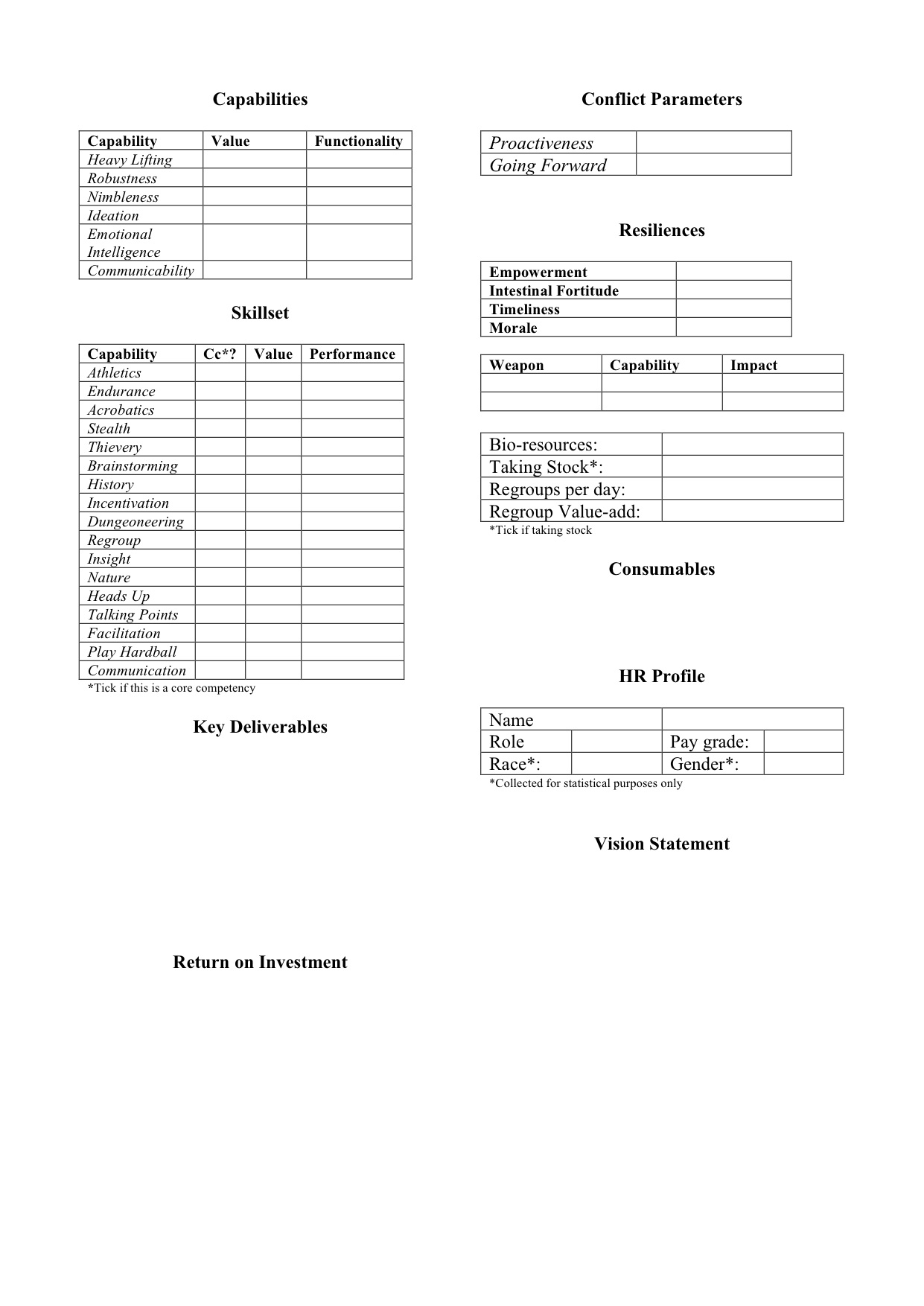 This character sheet is based on the D&D 4e Essentials character sheet, with the “skillset” separated from the “capabilities.” Follow the flow of that character sheet to see how they all fit in, though it should be obvious to anyone who is singing from the same hymn sheet as me exactly what should be actioned in, for example, the “Key Deliverables” section of the document. If you see a word you recognize, it’s because I can’t think of a suitable buzzword to replace it with. I considered putting in a statement about proper treatment of personal data and please destroy it if it has been emailed to you in error, but we all know that really those statements have no legal force. I think I haven’t used enough hyphens, and some of the nouns lose their full bullshit bingo force if they’re not used as verbs (or should I say, “verbed”).