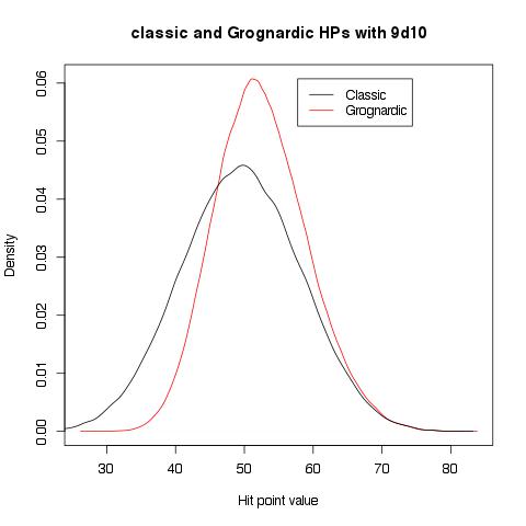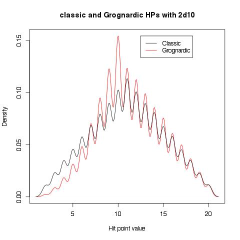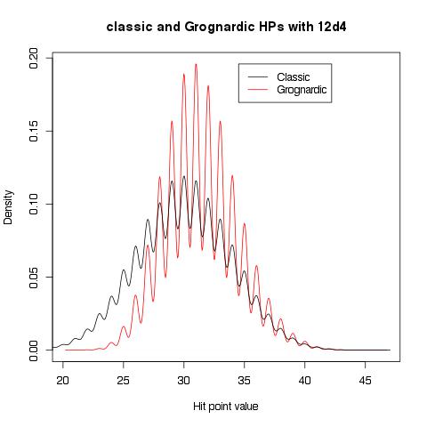 While preparing yesterday’s post I stumbled on a discussion of house rules and hit points at Grognardia, where James the Grognard describes his planned house rules for Swords and Wizardry. It’s old and I don’t know whether he ended up using them, but I noticed that his hit points rules induce a very strange, and in my opinion definitely not old-school, distribution of hit points. His proposed house rule is: