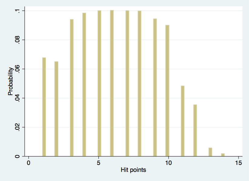 Figure 4 shows the distribution of hit points in this sample of 1 million fighters. This is not the distribution one would actually see in a sample of actual Pathfinder fighters, since in a real game most fighters will have non-negative constitution bonuses (unless their player has read this post, I suppose). This histogram shows an interesting effect, however: even when constitution is unrestricted, under a 4d6/choose-the-best-three system there is a heavy concentration of hit points in the range of 4 – 10. Median hit points in this sample were 6, and the average hit point total was 6.2: in fact, the hit point distribution looks remarkably close to a uniform distribution on the range 4 – 10!