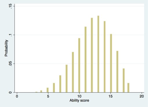 - All ability scores were generated using 4d6 choose-the-best-three, rolled in order: This is not orthodox Pathfinder but enables simultaneous estimation of the probability distribution of ability scores under this commonly-used rule, and enables analysis of the effect of ability scores across their full range – not just in the high values that one would usually assign to a PC’s prime characteristics