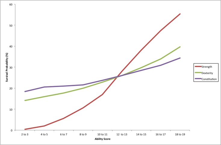 It is clear from Figure 1 that strength is the key determinant of survival for a first level fighter. Only 0.4% of the weakest fighters survived, compared to 55% of the strongest. Constitution has barely any effect on survival, and dexterity is only important at the extreme ends of its range.