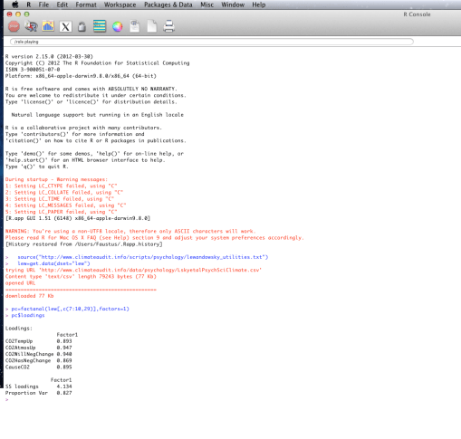 Someone was wrong on the internet! But actually we were talking at cross-purposes, and after I put up this picture we worked out the error. It’s connected with Lewandowsky’s paper: basically the two lines of code you don’t understand give you the results of the factor analysis of CO2-related questions in Lewandowsky’s study.