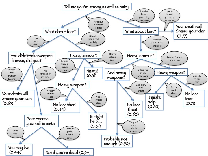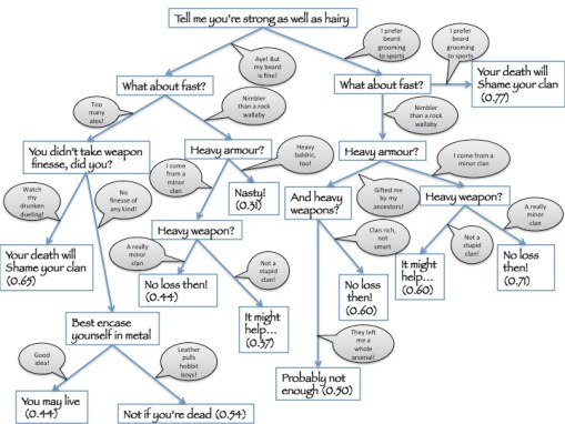 Following yesterday’s post, here I present flow charts for the best survival options for Dwarves (Figure 1) and Halflings (Figure 2). Both charts are based on CART analysis of the simulation data generated for yesterday’s post.