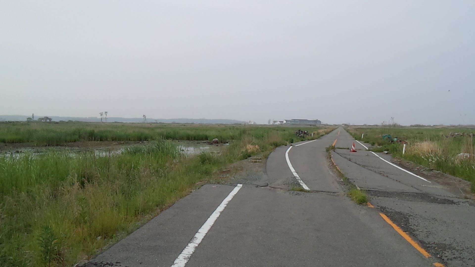 From that point we headed south towards the exclusion zone. This shot is looking back the way I came (you can see the same primary school looming on the horizon just to the left of the road). The road is, obviously, in a bad state: those traveling with me thought this was likely the effect of the original earthquake rather than the tsunami. I don’t like to think about how terrifying that earthquake was, because it was pretty scary in Tokyo and we didn’t see anything twisted or broken. The nuclear powerplant had to be resistant against this earthquake, and then the tsunami that followed, even though it was built 40 years ago. It’s quite a miracle really that it didn’t collapse completely. Note the pond to the left of the road: this is another example of nature reclaiming the area, and was rich with the sound of frogs and insects. Soon after I took this photo an enormous crane took off from the reeds and flew to the distant forest.