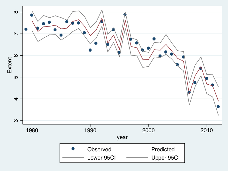 I put all these variables into a Prais-Winsten regression model in Stata/MP 12. Prais-Winsten regression models enable multiple regression fitting of a single outcome variable to multiple predictors under the assumption of residuals with auto-correlation at lag 1, a common assumption that it is necessary to make in order to adjust for the serial dependence inherent in all time series. Since my main interest in this task is the point estimate (mean) of sea ice extent, I could have used a simple linear regression, but this would have given overly narrow confidence intervals. I could have looked for other modeling methods but Prais-Winsten is trivially easy in Stata, and I am lazy.
