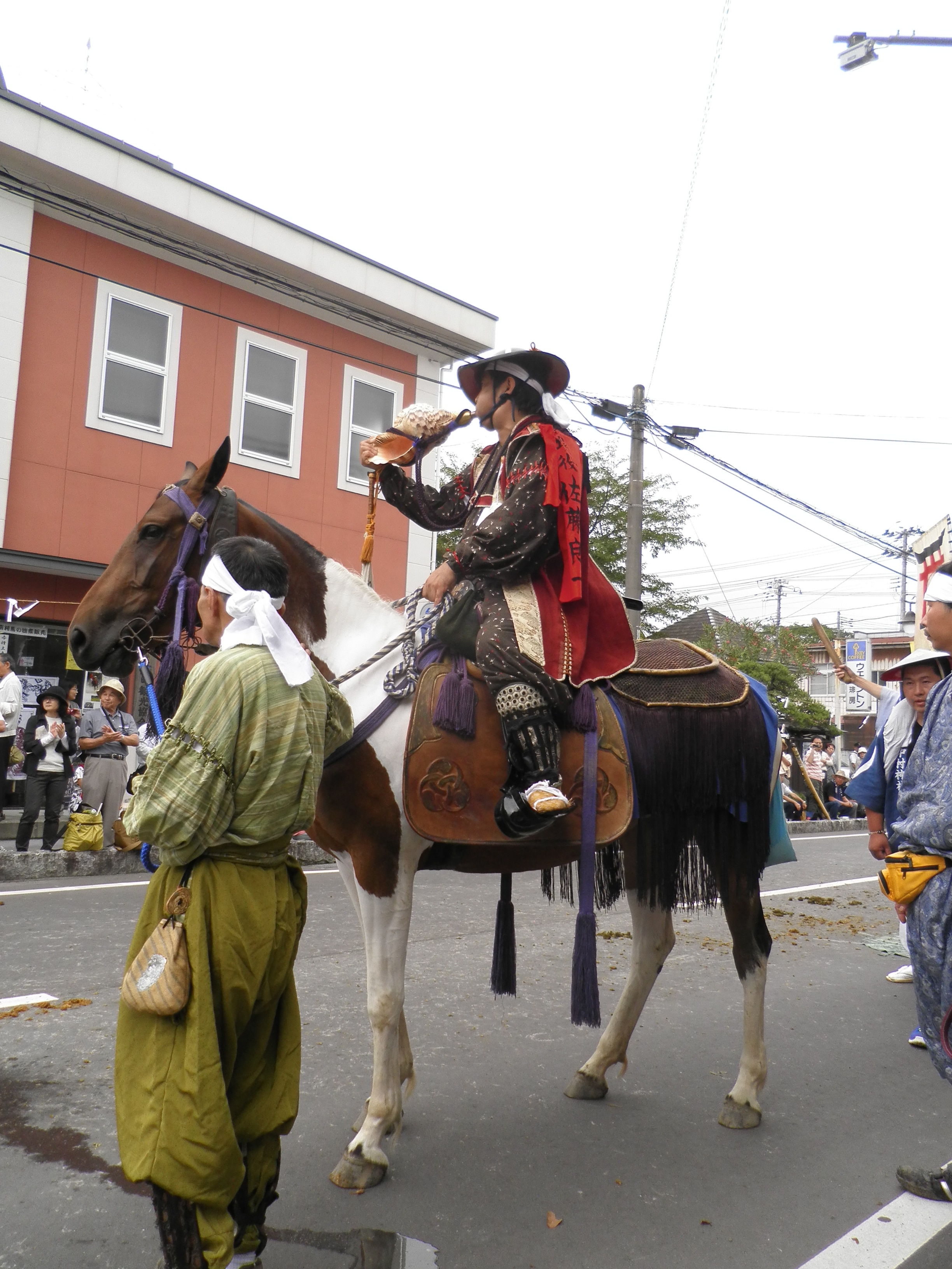 The ceremony lasts three days, but I only saw the second day. This day starts with a parade through town by the samurai, all mounted on their horses and wearing their ceremonial armour. They are arranged in groups according to their sponsors: the most important sponsors are the three shrines that are the focus of the day, but other groups – suburbs, companies, etc. – can also sponsor a squad. The squads are arranged in the style of the armies of old, with a general, colonels, etc. Higher orders wear flags on their backs, and ride ornately decorated horses. They stop at regular intervals along the parade to announce their purpose, and occasional small dramas of military life are played out (with comedic overtones) during these moments.