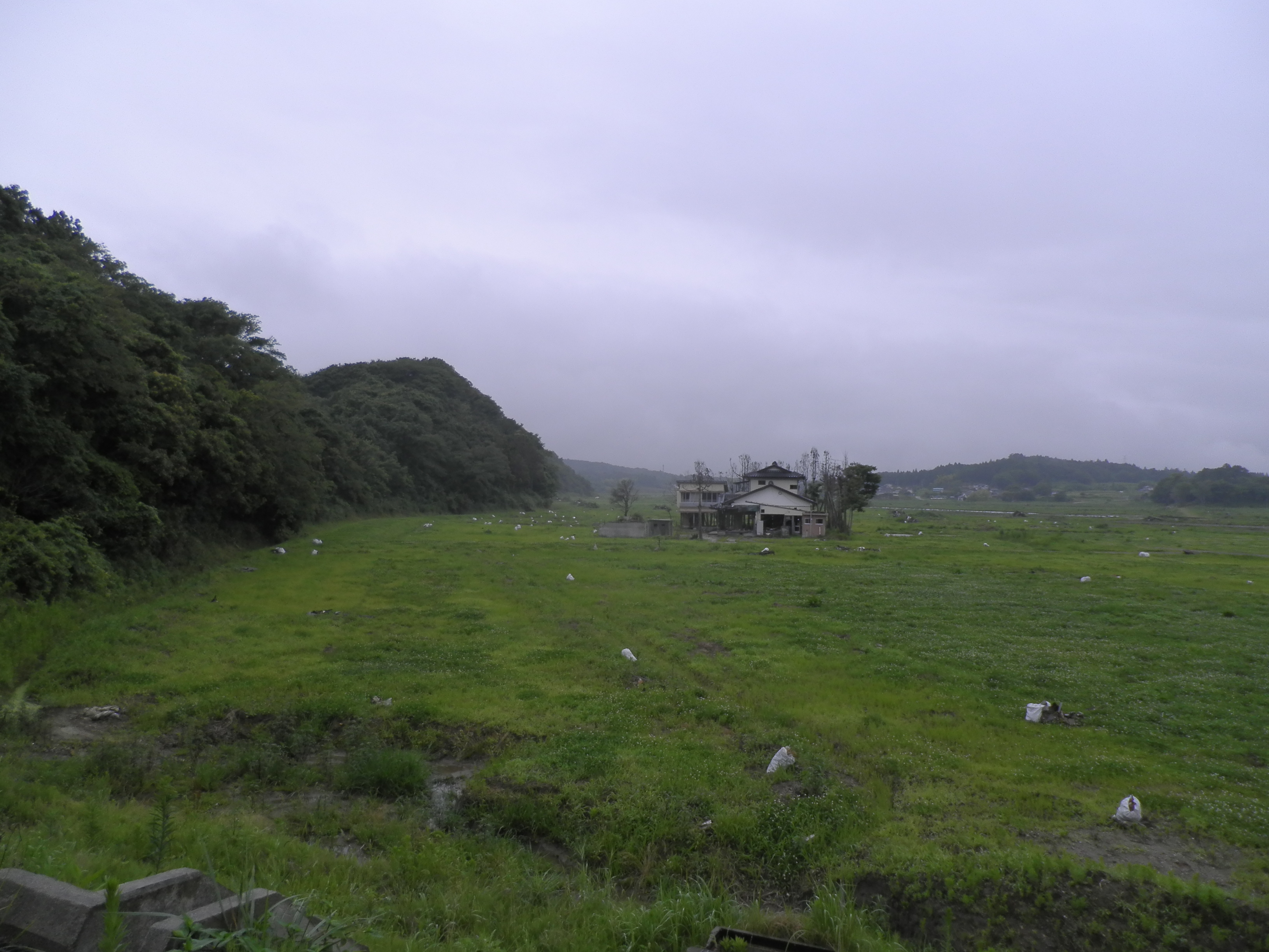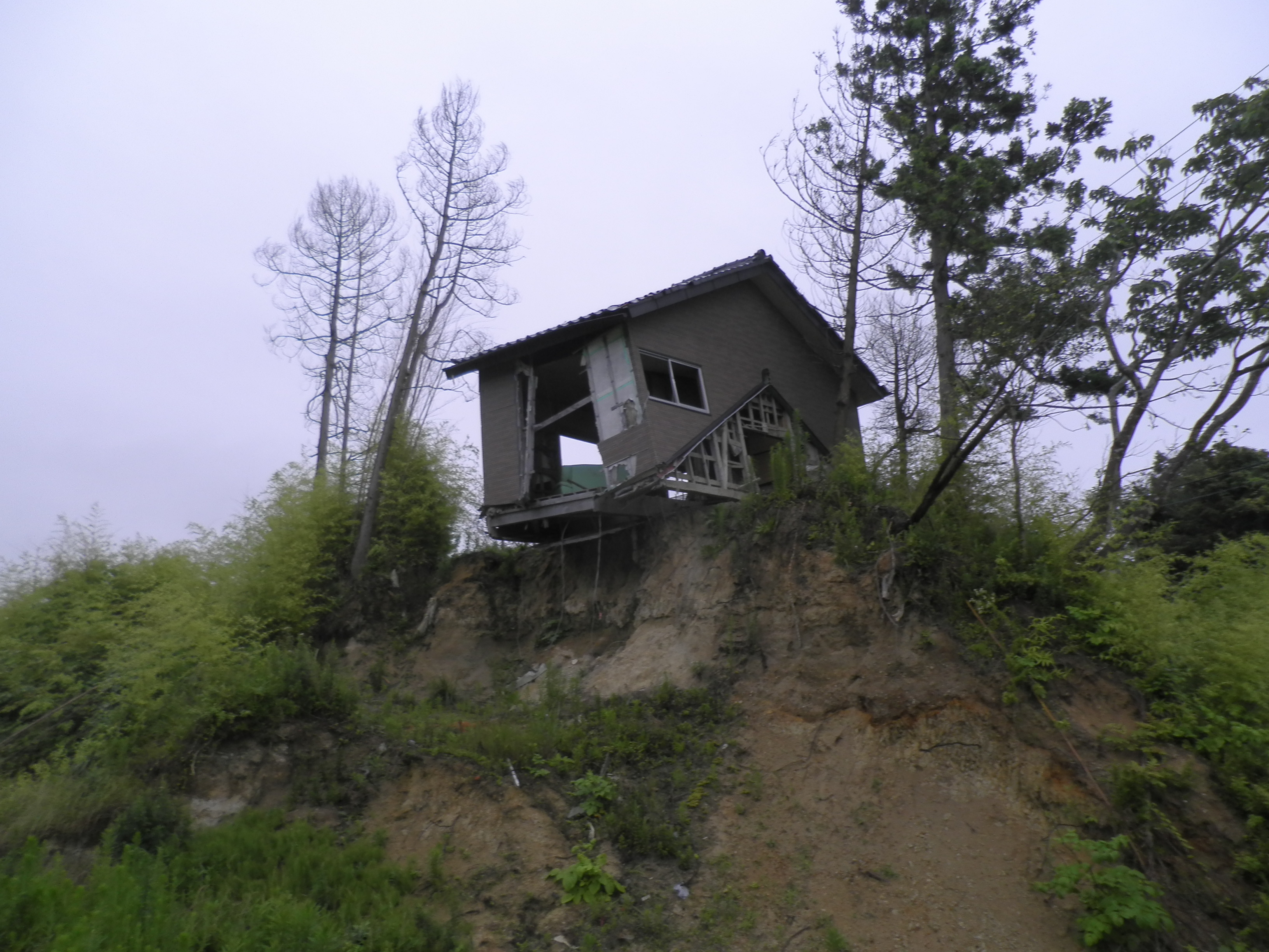 These tetrapods were on the outside of the sea wall (which is itself perhaps 3-5m high). They had been carried over (or in one case through) the sea wall and dumped inland at this distance. It’s hard to imagine the ferocity of a wave that can do that. But our imagination was assisted when we passed over a nearby rise, and found the second story of a house lodged amongst trees at the top of the knoll, a sofa still trapped in the room.