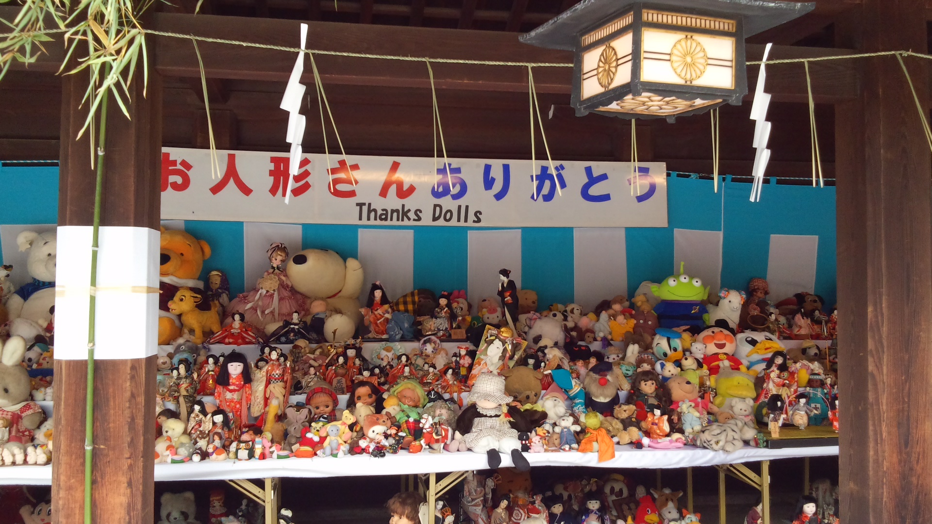 Today I visited Meiji Jingu to attend one of the stranger rituals I have seen in Japan: the Doll Appreciation Ceremony (oningyo kanshasai,お人形感謝祭). This ceremony takes place once a year under the sponsorship of the Doll Appreciation Society, and is held to venerate those dolls that are being passed out of use. The information we received when we entered the shrine told us that many Japanese people believe that dolls have souls, and that many shrines hold ceremonies to venerate or consecrate dolls when they are thrown out. The basic process is you bring your dolls (as many as you want) in a plastic bag, and get charged 3000 yen (about $US30) per bag. You are given a doll-shaped piece of paper to write a message on, and then the priests very carefully arrange the dolls within the shrine precinct. Once the viewing period is over, the good wishes you wrote on the piece of paper are incorporated into a ritual of consecration, and then the dolls pass on. It’s not clear what happens, but I’m guessing they go into landfill. But appropriately consecrated.