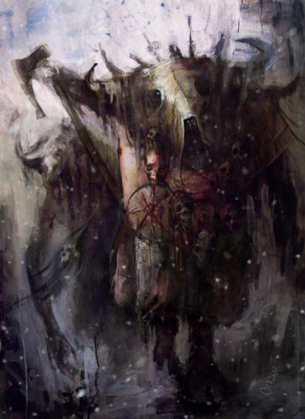 Other murders soon followed, with the maid, the landlord and his wife quick to succumb to some kind of brutish and supernatural force. Every time the murder was so reminiscent of Mercads’ artwork that the PCs just had to return to his cell to watch him, but the third time they returned they found him, too, dead, torn apart in the same way as the others. However this time they were fast enough to see the killer – a grotesque, incorporeal ghost, 3m tall and shaped like a beastman with a single eye. They attacked the ghost but it fled too fast, disappearing through a wall and out into the wilds of the night. Shocked, they realized that Mercads must have been the channel or conduit for some darker creature. They remembered finding a necklace made of a fleck of old beastman’s tusk when they captured him, and wondered if he might have been somehow connected with this ghost. While some of the PCs rushed to protect the guests in the common room, Gregor dashed to their own room to check on the chaos artifacts they were transporting to Heavenbalm, lest that should prove to be this beastman ghost’s true focus.
