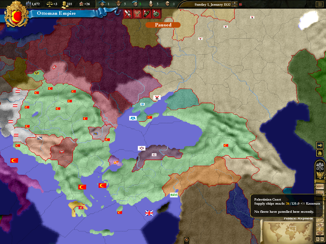 After Huseyn’s death in 1509 our current glorious emperor, Huseyn II, ascended the throne. His plans of completing the conquest of Hungary were delayed, however, by the western powers. In 1510 the distant kingdom of Castille noticed our expansion – perhaps word of the beauty and munificence of our Imperial lands reached the Castillian King in his dismal narrow-windowed castle, sparking his jealousy – and a warning was issued. Our people barely new of these great and distant powers of France, Castille and Britain, and we thought our affairs and theirs completely disconnected, but this was to prove far from the case. Because the people of christendom follow a religion based on idolatry and cannibalism, they must always be jealous and frightened in the face of the Prophet (may peace be upon him); though we had no conflicting interests and our Caliphate has only ever sought peace, the infidels of Castille sought to chastise us from their distant cities. For seven years they sent ships full of pale-skinned minions to harry our shipping lanes and blockade our ports, and in one dismal year they even landed their sweaty and ill-prepared troops on the western shores of our Greek conquests. But here, too, we showed them the teachings of the One True Faith: our fleets sank and destroyed their fleets, and when they had the temerity to land men on our hallowed shores we defeated them, drove them back into the sea, and tossed the survivors from the cliffs of Montenegro. After 7 years a mealy-mouthed, pale-skinned wretch came to us begging peace, and though in truth our glorious armies were preparing to launch an invasion of Castille, Huseyn II showed his famous mercy, and brokered a peace that until this day has been unsullied.