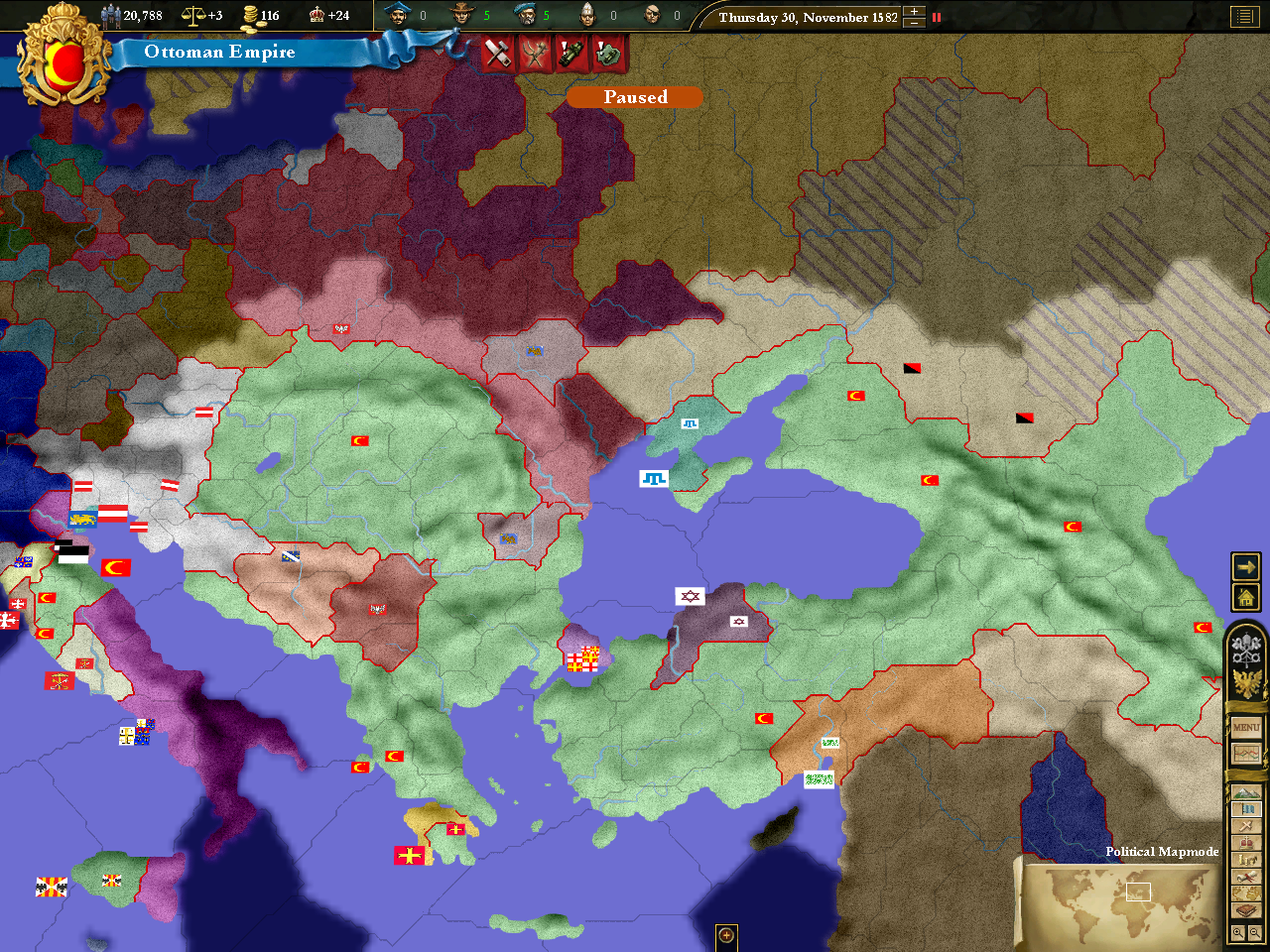Before his death in 1564 Huseyn II implemented imperial rule across this whole vast land, but sadly his successor Seyfetim I achieved nothing with the fruits of Huseyn’s work or the new-found enlightenment, and died leaving only bastards. After a brief struggle amongst them, Mehmet I cousin of Huseyn II took the throne, and he rules to this day in glory from the centre of our Empire. In his wisdom Mehmet I realized that it is not enough to take possession of the great centres of learning in Christendom, and thus to restore the legacy of Islamic thought to the Empires of Islam; like a wise and learned father, the Ottoman Empire must also chastise those of its more junior and less educated Muslim brethren, and bring the true fruits of Islamic thought to them. Nowhere was this more the case than with the Golden Horde, that great seething sea of barbarity spreading east of our holy land, which was barely Islamic except in name, and ruled by degenerate horse-loving wretches from beyond the great deserts. This Horde was a constant problem on our borders, and served to destabilize all it was in contact with. What the folk of the Horde needed was discipline and education, in equal measure. And who else should offer such, but a loving and firm-handed father?