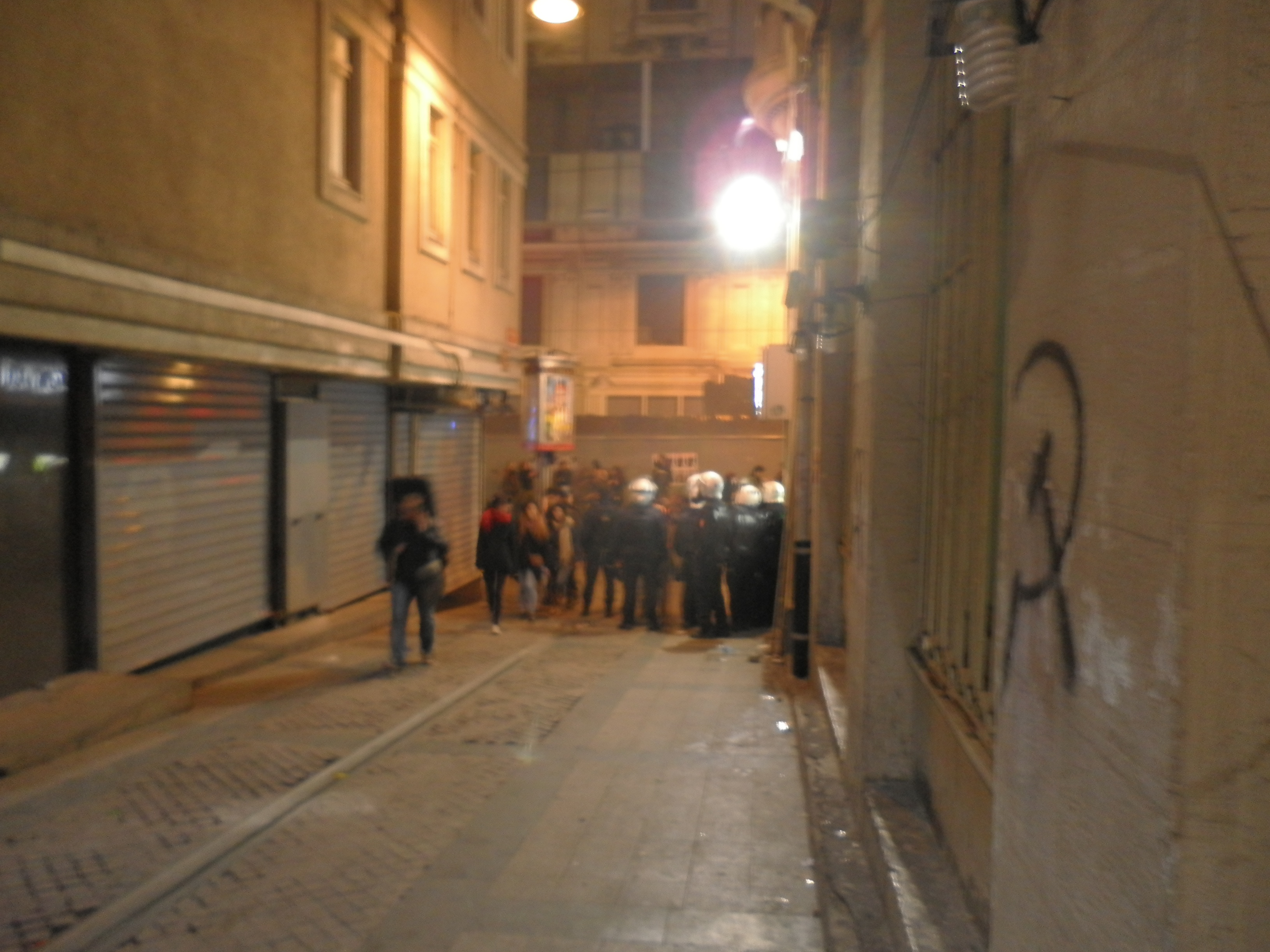 From here I did a bit of exploring and emerged in a new alleyway facing onto Istiklal. There was a wall of riot police between me and the main street and they didn’t seem interested in letting anyone through, so I stayed in the alley and took a photo. Unfortunately, I didn’t see a lone riot policeman behind me, and turned around to hear him yelling at me and advancing rapidly towards me, baton in one hand and attitude in the other. By now everyone was strung out on the tension, and this guy had probably just been in a fight, he wasn’t impressed by my little 7000 yen camera. I backed up with my arms spread and said clearly and slowly “I’m sorry, I don’t speak any Turkish,” and that immediately calmed him down but he was still fuming – he started yelling at me in the international language of “fuck off” (fortunately now obviously not intending to cave my head in) and I decided to take his sage advice. I probably should have taken, earlier, the advice of my embassy and not hung around large and aggressive gatherings, but hey … so far so good, right?