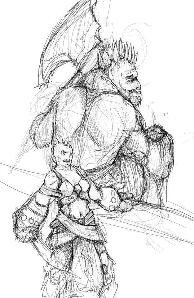 They lured the guards in groups into a tunnel, and killed them in this tunnel. Unfortunately, killing the Ogrun was tough and they forgot about the demonic hunter and its wizard-demon master; they thoroughly exhausted themselves killing the Ogrun, and so were standing, spent and desperate atop a pile of Ogrun corpses, when the demonic hunter arrived. After a moment to gloat over their predicament, it attacked. They were unready, and could barely fight for exhaustion. First it hit Carlass, gutting her with a single blow, before moving across to strike Catrina. Catrina was torn to shreds immediately, her body cast around the cave like so much meat. The beast then turned its attention on Breaker, but couldn’t kill him with a blow. The dwarf attacked it then from behind, but it knocked her back and nearly killed her with a single blow before returning its attention to Breaker. Now Carlass hauled herself upright, despite her massive injuries, as only a trollkin can do, and called down a desperate curse on the beast – a curse that channeled all her rage and all the desperate futility of her ancestors and her extinct tribe. Her curse reinvigorated Alyvia and Breaker[1], who were able to make a final desperate attack. Alyvia’s attack missed, but it distracted the hunter long enough to give Breaker the opening he needed. Even though all he had was a pathetic Ogrun scimitar, he managed to eviscerate the demon[2], and tossed its broken body aside to run to Carlass.