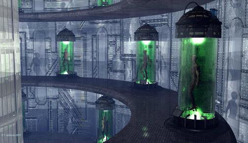 Things down here were pretty simple, probably because Goliath was expecting any trouble to be ghetto dwellers breaking out, heading up, not trained soldiers breaking in and heading down. There were no guards, and we soon broke into the research complex. Finally we found the central labs. After we had rampaged through a couple of supply rooms we hit the central labs, where there were six research scientists cowering at their desks and trying to look all innocent, like they were just doing experiments on flies or something. The bodies, the graphics on big screens, and the people suspended in cryogenic units suggested something different. The room was suffused in a calm blue glow from the cryogenic units, maybe 10 of them, in each of which a real actual person was slowly metamorphosing into a monster. Something terrible was happening here, and we all wanted to know what it was. Ghost ran to access a computer terminal, yelling at one of the scientists to give him details while Coyote threatened the guy with his massive pistol; Carbon sprinted through to secure the far door.