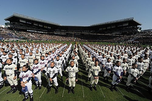It isn’t just the contest itself that is great – in fact that’s barely part of it at all. Rather, the culture and the style and excitement of the entire series gives it a feeling that ordinary baseball just can’t get. Similar to cricket at its best, it has its own sound and pace, and the crowd are as much a part of the event as the teams. Every team brings a huge contingent of supporters, wearing school colours and usually including a school band and cheerleaders, who make a constant racket throughout the game. This highlight reel is a good a example of the sound of the game – the school song (or a supporter’s chant) playing in the background, drums, pipes, cheering, and the flash of pom-poms as the cheerleaders go wild on a home run. At the end of the reel you can just hear the announcer in a classic, high-pitched voice introducing the next batter, with the honorific “kun” at the end to remind everyone that these heroes of ours are actually just high school kids. During the match the commentators prowl the stands interviewing fans, and showing the world what ingenious support methods the schools have thought up; they read support messages from school children and adults around the country, and every day they have a different pro-baseballer on to help with the commentating. This year the commentators have identified a man they call “Rugger san” (Mr. Rugger) who sits in the same place directly behind the batter in the front row, and is so named because he wears a rugby shirt every day – he has been there the entire two week period. It’s a serious, extravagant two week festival of sport, very similar to the Ashes or Sumo in the strength of its associated support culture, its deep connection with a season, and its importance to ordinary sports fans. But in this case it has its own bittersweet feel, because these are boys near the end of high school, who are going to get one – maybe two, for the younger ones – shots at glory, then graduate and move on with their lives and leave this fleeting moment of fame and joy behind them forever.