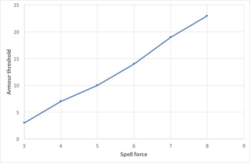 So my first finding is that while in theory direct spells might be useful against heavily armoured foes, they typically are only better than indirect spells at very high levels of armour, and if you’re playing a mage capable of spells of force 6 or higher you are unlikely to be meeting the kind of armoured foes against whom you need to deploy your direct spells.