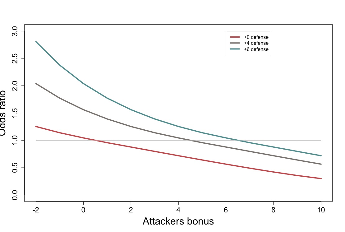- Comparing the probability of success for a highly skilled attacker against a low-skilled attacker, across a wide range of defensive bonuses
