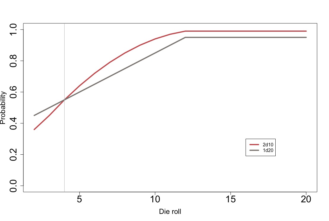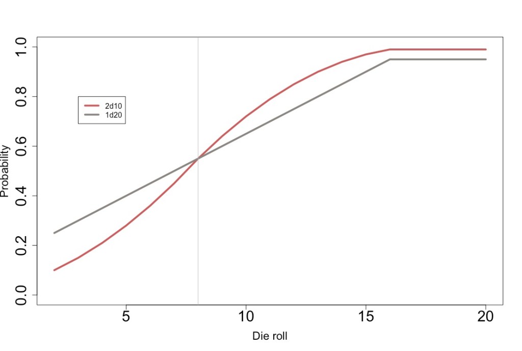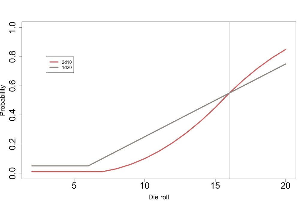 We’ve all been there: Your PC is up against a much weaker opponent, deploying your primary power or skill, but in the crucial moment the d20 roll comes up low for you or high for the opponent, and you once again find that your best power failed you when you were sure it would work. This happens all the time in D&D because the d20 has a flat distribution and that means that low rolls are just as likely as high ones. Although this means on average you might expect your best power to work, unless you are absolutely obliterating your opponent you can’t rely on the dice to turn up even in the ballpark of where you need them to be. This is also a problem in Cyberpunk (d10) and Warhammer 2nd Edition (d100). I have always found it really frustrating, because if use a peaked distribution we can be fairly confident that the dice will roll around about the middle of their distribution more often than the edge. I have complained about this many times, but I have never bothered to see how big a difference a peaked distribution would make to the flow of the game. So here I compare the easiest peaked distribution, 2d10, with 1d20 as a basic die structure for D&D. I have chosen 2d10 because the average roll is about the same as 1d20, and its most likely value is close to the basic DC values of D&D, which are abut 9-11.
