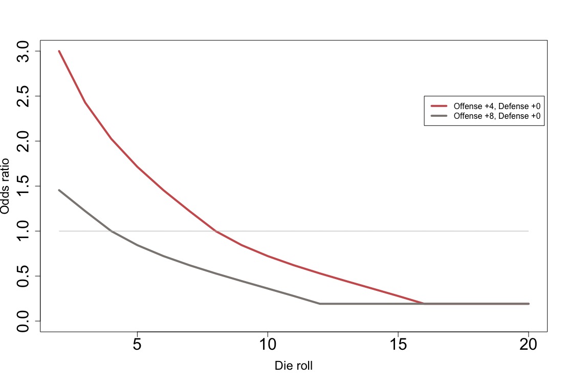 In this case I have shown only the case of an offense of +4 and a defense of +0, and an offense of +8 vs. a defense of +0. I used only these two cases because the case of +0 vs. +4 has such huge odds ratios that it is not possible to see the detail of the other two cases. This figure shows that for an offense of +4 and a defense of 0, the 1d20 has 2-3 times the odds of success at low numbers, but also much lower odds of success at high numbers. Effectively the 2d10 smooths out the probability patterns across the die roll, so that you get less chance of success if you roll poorly, and more chance of success if you roll well, compared to a 1d20.