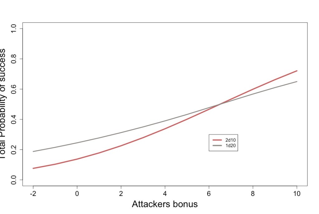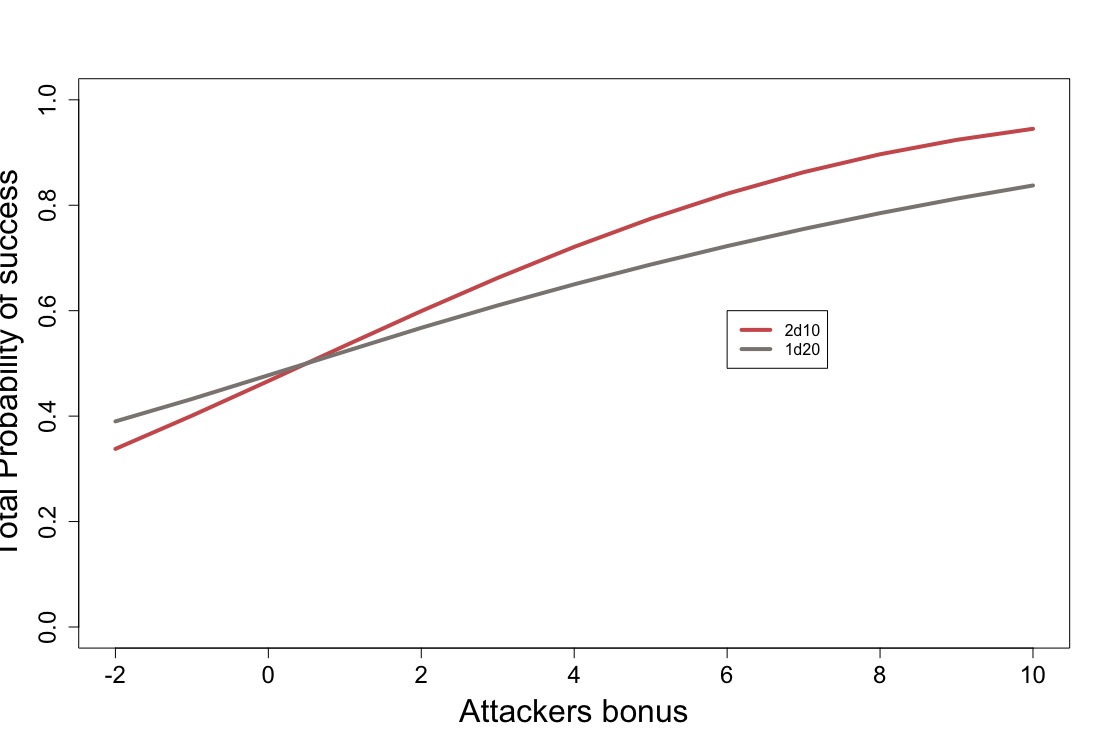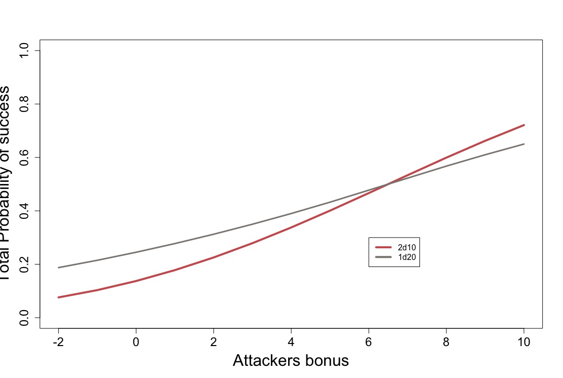 - Estimating the total probability of success for the attacker across a wide range of possible skill bonuses, and comparing these probabilities for 1d20 and 2d10