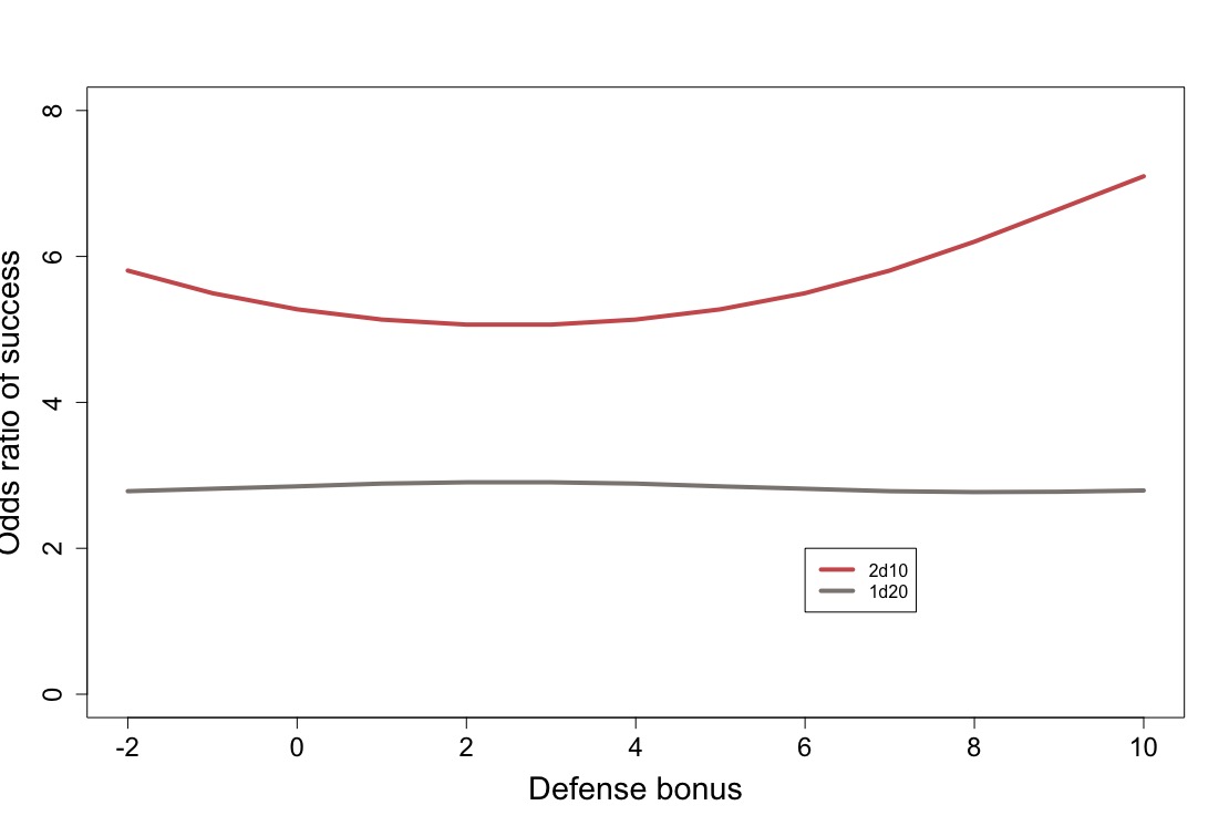 This effect is shown in Figure 9, where I plot the odds ratio of success for a PC with +6 bonus compared to +0 bonus, against defense bonuses ranging from -2 to +10, for both dice systems. It shows that across all defense bonuses the odds ratio of success for a PC with +6 bonus is about 3 times that for a person with +0 bonus when we roll 1d20. In contrast, with 2d10 this odds ratio is closer to 6, and appears to grow larger as the defense bonus increases. That is, as the targeted task becomes increasingly difficult, the 2d10 system rewards people who are specialized in that task compared to those who are not; and at all difficulties, the difference in success chance for the specialist is greater than for the non-specialist, compared to the 1d20 system.