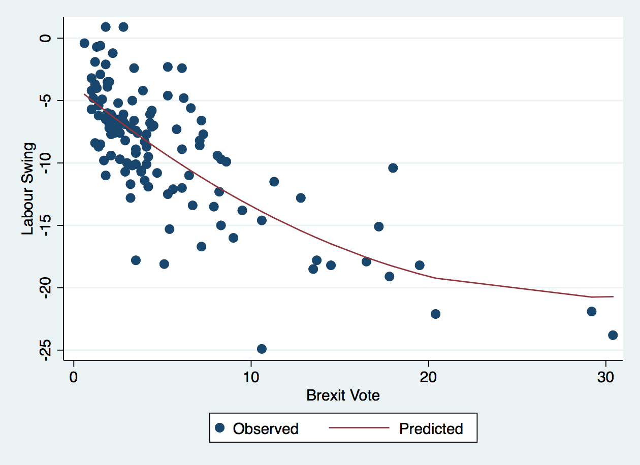 - A linear regression of Labour party swing as a function of leave vote in the EU Referendum