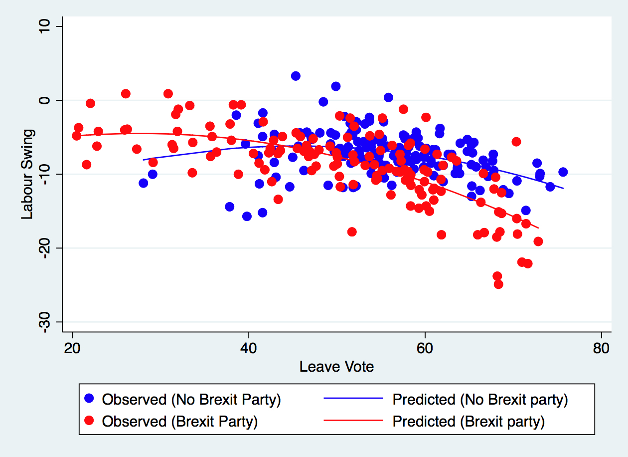 It is clear from Figure 2 that the swing against Labour was smaller in seats with a Brexit party challenger that voted to remain in the EU. In seats not held by Labour, the swing against Labour was larger in seats that were either strong leave-voting seats or strong remain seats. In these seats – the seats Labour had to win to win government – Labour was being squeezed in both strongly remain and strongly leave seats. In the seats Labour already held (mostly with a Brexit party challenger), or that it did not hold but faced a Brexit party challenger and a Lib Dem or SNP incumbent, the party faced intense pressure due to brexit. In seats it held that had a large leave vote Labour was completely smashed. These seats are mostly in the famed “red wall”, the northern seats that Labour has always been able to rely on. Note the largest positive swing to Labour occurred at about the median leave vote, between 45 and 55.