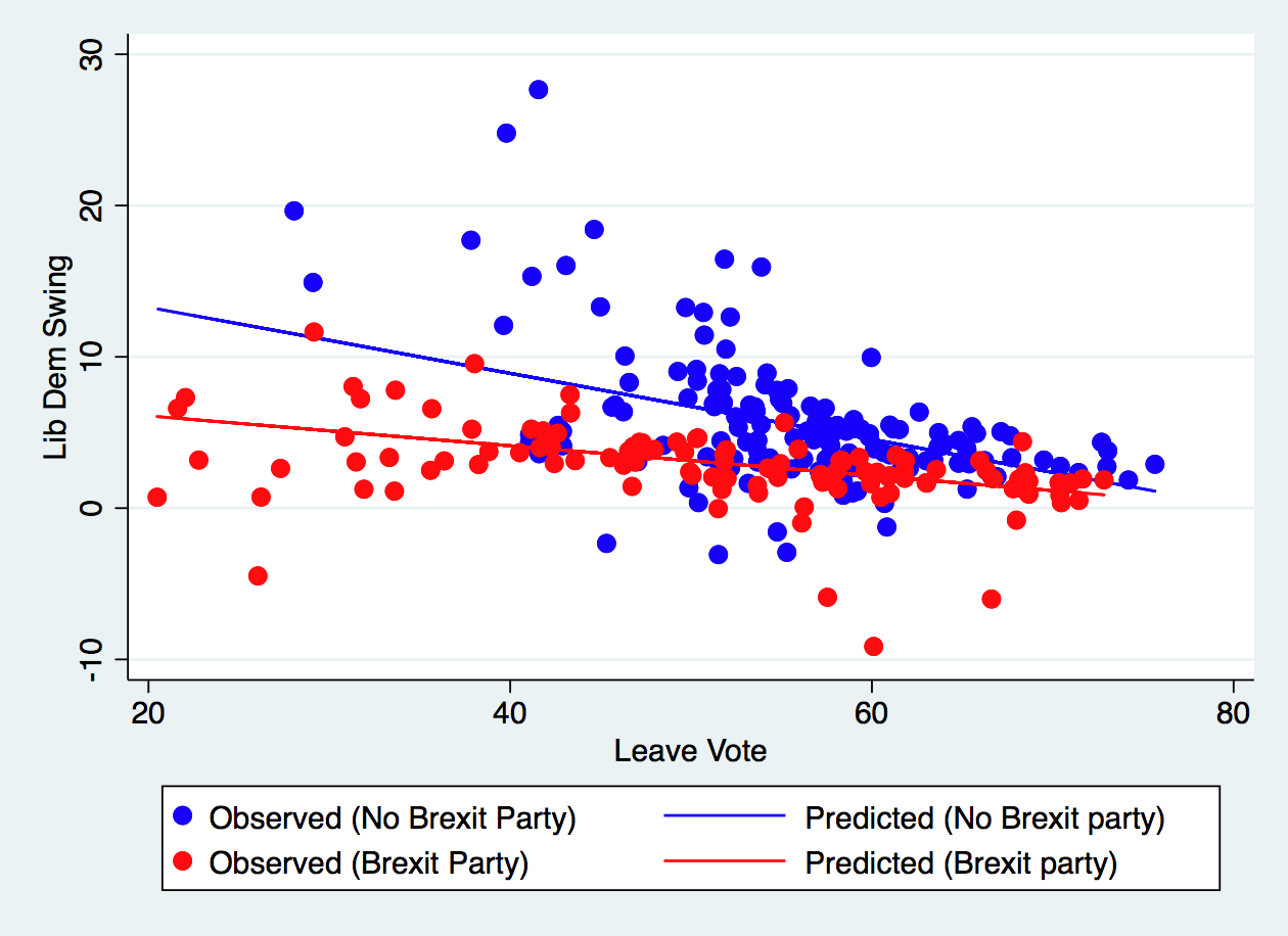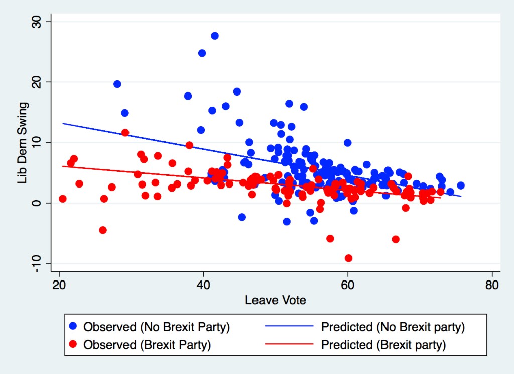 - A linear regression of Labour party swing as a function of Brexit party vote