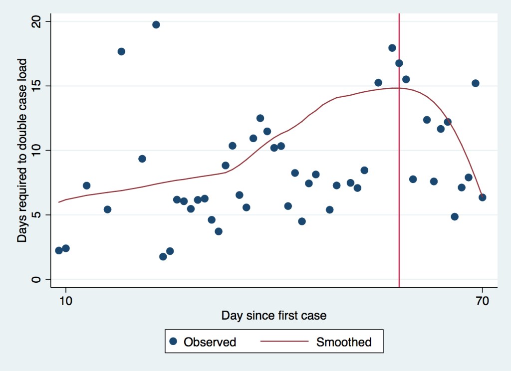 It is very clear that as measures stepped up the doubling time gradually increased. In this figure day 40 is the first of March, the first day that national measures were announced. Despite this, we can see from Figure 3 that it took Italy about a month and a half from the first case to slow the spread enough that further doubling might take a week, and early inaction meant that a month of intensely aggressive measures were needed to slow the epidemic, at huge cost.