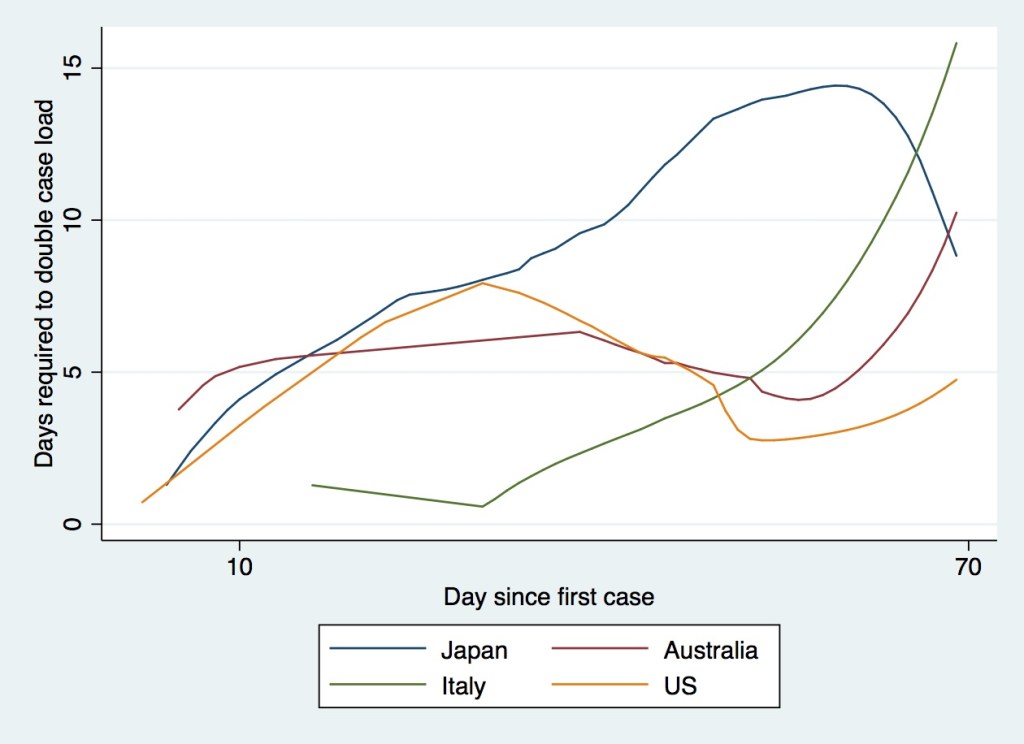 It’s instructive to compare this doubling time with some heavily-affected countries. Figure 3 shows the smoothed doubling times for Japan, the US, Italy and Australia. It has the same axes, but I have dropped the data points for clarity (I make no promises about the quality of these hideous smooths). The legend shows which country has which colour. Italy and Australia start slightly later in this data because their first imported case was not at day 0.
