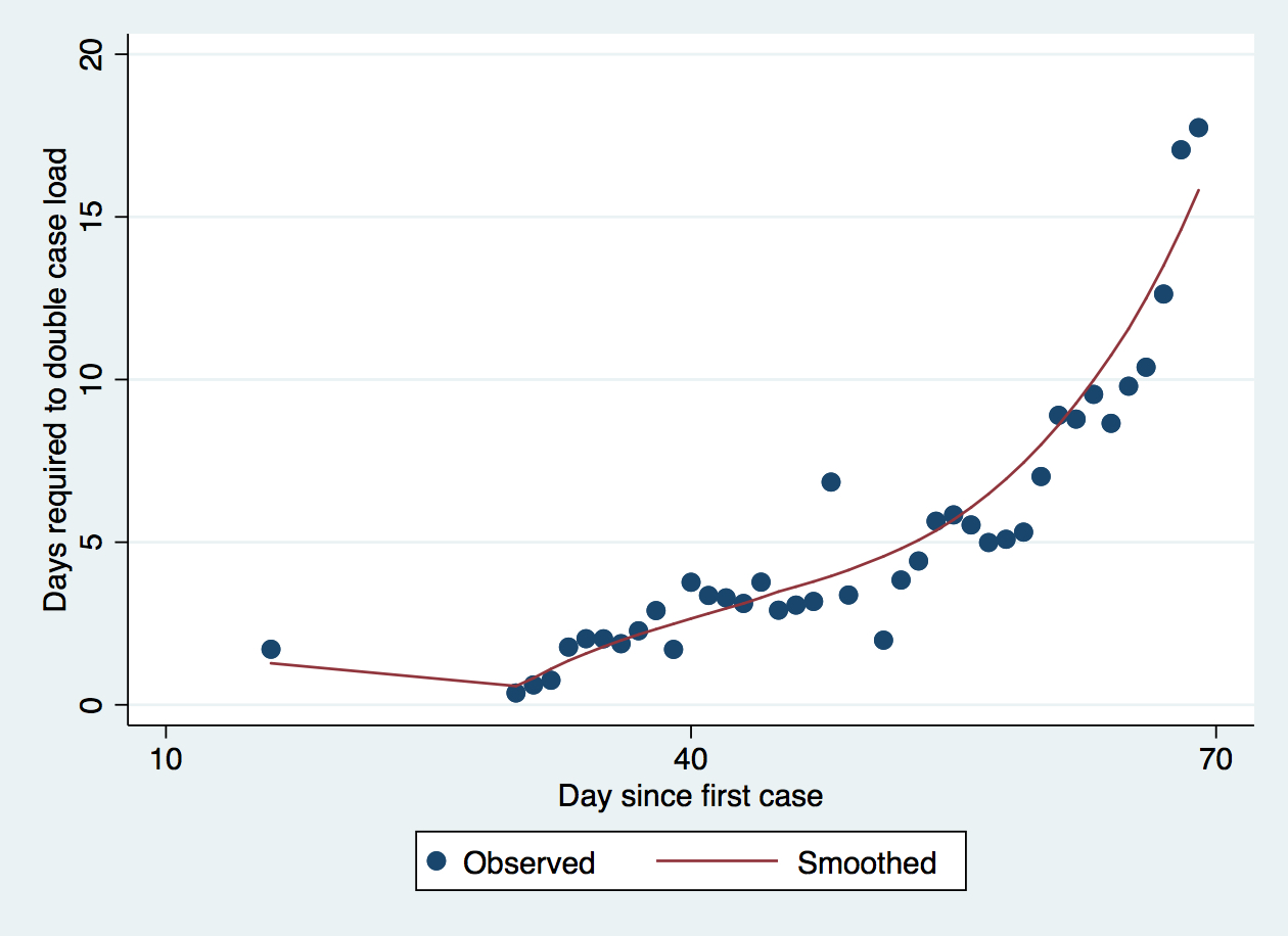 It is very clear that as measures stepped up the doubling time gradually increased. In this figure day 40 is the first of March, the first day that national measures were announced. Despite this, we can see from Figure 3 that it took Italy about a month and a half from the first case to slow the spread enough that further doubling might take a week, and early inaction meant that a month of intensely aggressive measures were needed to slow the epidemic, at huge cost.