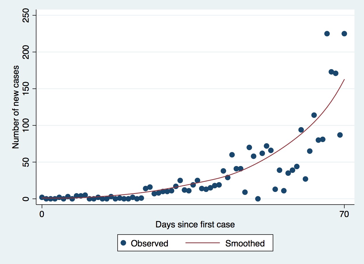 It is possible to see the effect of this party atmosphere in the data, and it offers a strong example of how important social distancing is. Using the data from the Johns Hopkins Coronavirus tracker (and making a few tiny adjustments for missing data in their downloadable file), I obtained and plotted the number of new cases each day, shown in Figure 1 below. Here the x axis is the number of days since the first infection was identified, and the y-axis is the number of new cases. Day 70 is the 1st April. The red line is a basic lowess smooth, not a fancy model.