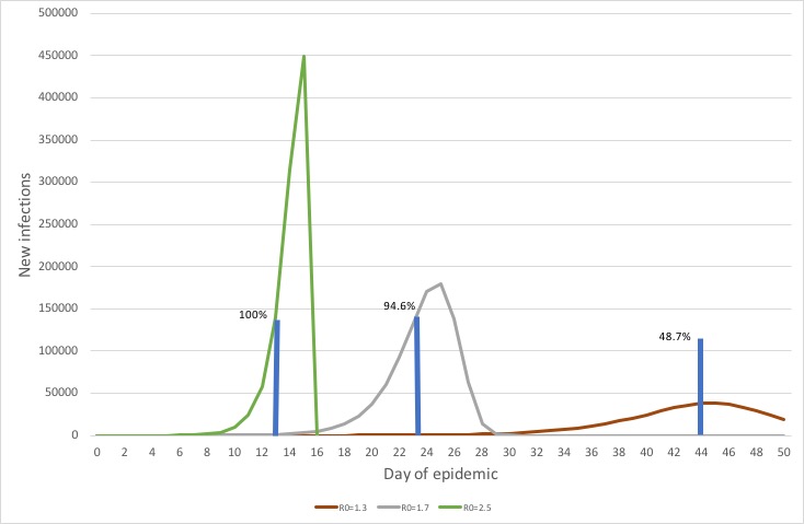As you can see, when R0 is 1.3 (approximately seasonal influenza), we cross the approximate Johnson Immunity threshold at 44 days after the first case, and at this point we have a daily number of cases of about 40,000 people. This disease will ultimately infect 49% of the population. Note how slowly it goes down – for about a week after we hit the Johnson Immunity threshold we are seeing 40,000 or so cases a day.