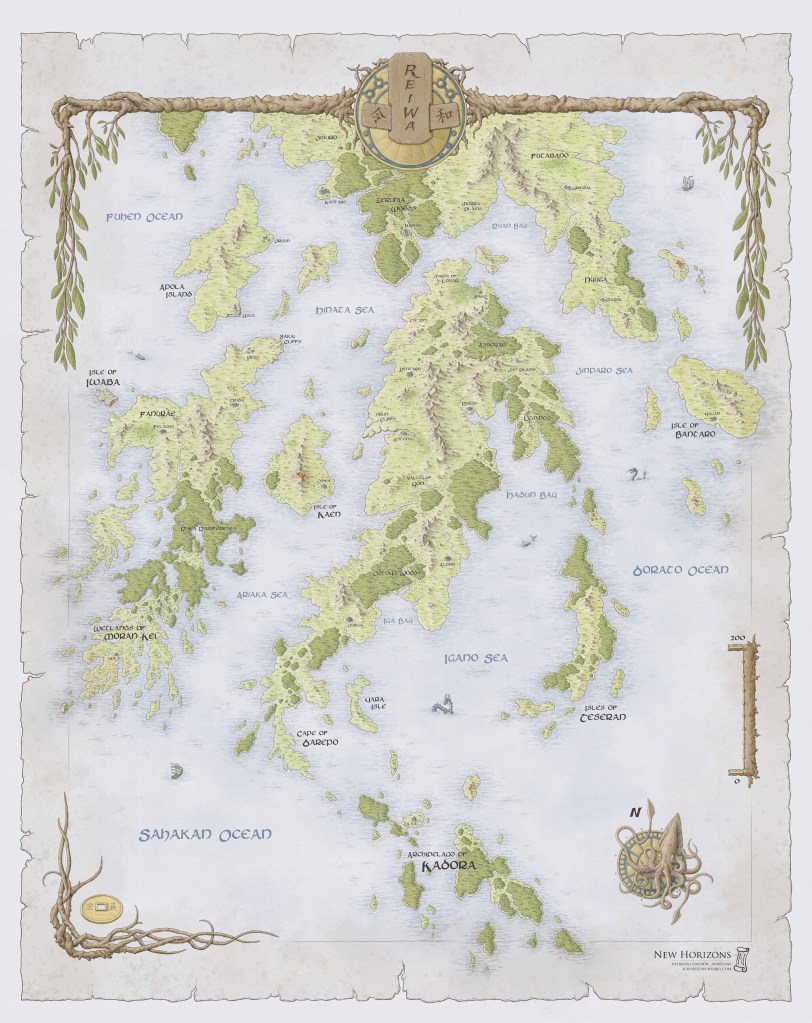 The Archipelago is a collection of island kingdoms of manageable size, isolated from any major landmasses and connected by stormy but navigable seas. There are 8 nations of human settlements, a large wild area occupied by human-like tribespeople called wildlings, a single island for dwarves, and a couple of forests where elves live. There are also a few members of a race of people called Changelings, who are like humans but smaller and a bit weird, who live in hunter-gatherer societies and can change their form to perfectly resemble any human they have ever seen. The entire area is also plagued by deepfolk: orcs, goblins, ogres, dark elves and deep gnomes who are implacably evil and hate humans with all their heart and soul (if they have a soul). The deepfolk live underground and come out through hidden entrances and lairs in mountains, hillsides and forests, and there is constant conflict between these nasty creatures and humans. There are also other monsters in the forests and mountains, and one island has been ravaged and taken over by a dragon.