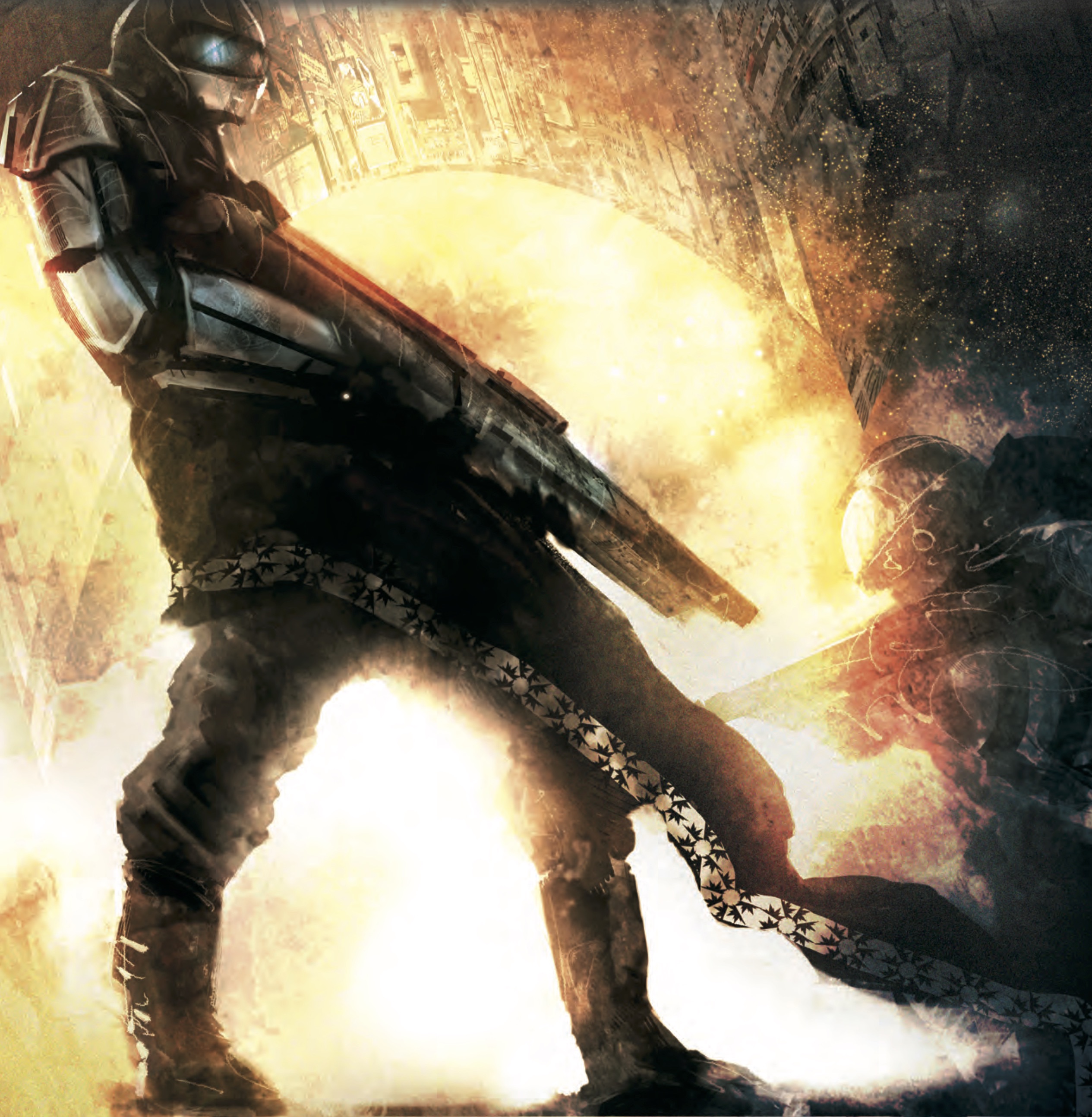 The third wave walked straight into the full fury of Adam’s machine gun, and were cut down viciously. As soon as the second wave’s leader had been put down by his own men Al Hamra dominated the third wave’s leader and forced him to attack his own men, and also to tell the station’s central command that the intruders had been killed. This strategy only partially worked; the fourth wave hit while they were cleaning up the remains of the third wave, and finally they were forced into a pitched battle with the remaining troops. By this time Siladan had been disarmed of his dura halberd and was fighting with his hand fan, several of the team’s weapons had overheated or malfunctioned (including Clementine’s meson pistol, which they needed intact to fight the exo armours), and finally Al Hamra took a hit from a vulcan carbine that completely destroyed his droid casing, killing his robot shell and forcing his consciousness back to the ship.