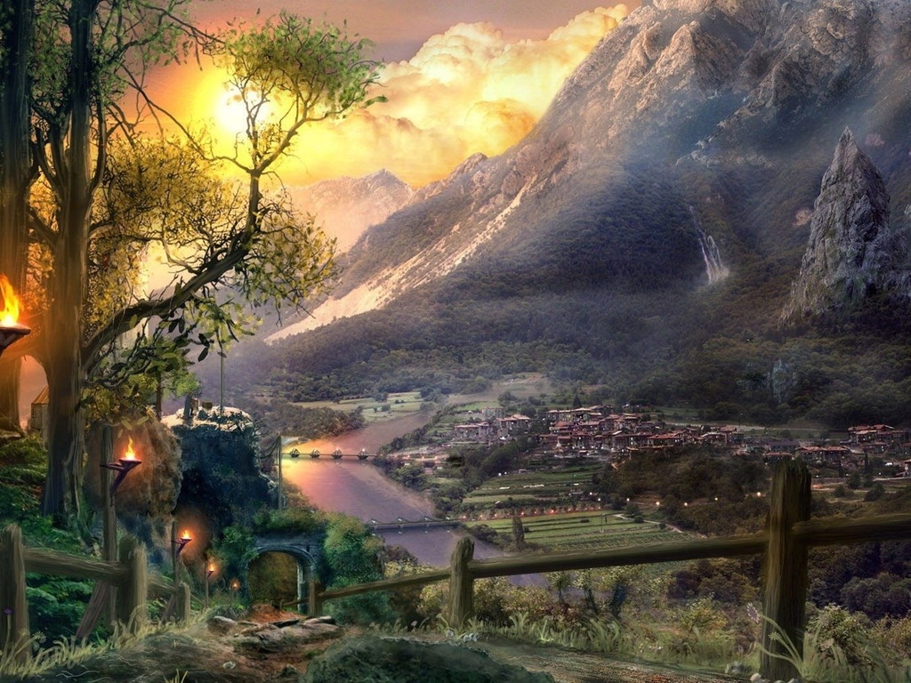 Estala lies in the bend of a river, its southern flanks protected by this deep and fast-flowing river and its northern side guarded by a stone wall that stretches from the eastern to the western edge of this large curve in the river. All of Estala is nestled inside the twin barriers of wall and water, with the northern gate of the town looking out from the walls at the looming mountains, while the southern entrance is possible only through four fortified bridges that are all separated from the mountain side by the river itself. Within this oxbow and its northern face, the town is said to be secure. Yet here they could see multiple smouldering fires, and when Quangbae used his telescope he could clearly see that the northern gate had been smashed in. The fires now smouldered, likely lit in a raid the night before and damped down during the day. He could see frantic activity in the town, as people repaired the damaged gates and attempted to make the town safe before nightfall. Hugo Tuya became very agitated at this report, and urged them into the town; convinced by Quangbae’s reconnaissance that it was safe, they headed down the hill to the river’s edge and the dawn bridge, from which they would enter the town’s south eastern suburbs.