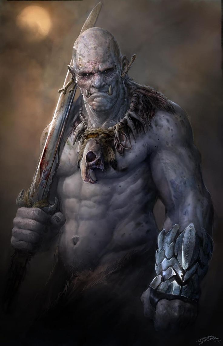 Next to the orc captain a Grigg skulked, dressed in leather robes and dragging one of the townsfolk by his hair. This man was a middle-aged merchant type, his once-rich clothes torn and ruined and muddy and his face bruised. His thighs and upper arms had been shackled together so that as the Grigg dragged him around he was forced to duck-walk and stumble and squat-jump after the Grigg. Even in the grim half-light the guards could see his eyes darting about and feel his exhaustion and terror. It was their first experience meeting deepfolk, and his fear was contagious.