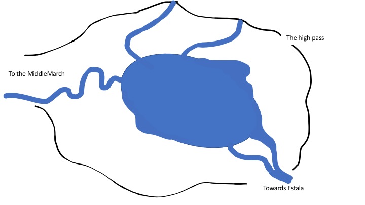 This search took them two days to complete, and when they were done they had some sense of what had happened. A force of deepfolk raiders had come out of the middlemarch, traveled through the Cauldron Lake area and exited the valley to Estala. At the edge of the valley they made camp, and at some point between leaving the valley and reaching Estala they had likely split, with a small force heading to the the observatory. That force, after sacking the observatory, traveled over the high pass and returned to the mouth of the valley facing Estala, where they camped and met up with the remnants of the force that attacked Estala. Together that force then retreated through Cauldron valley to the middlemarch, losing a member and a telescope at the entrance to the middlemarch before disappearing into the mountains.