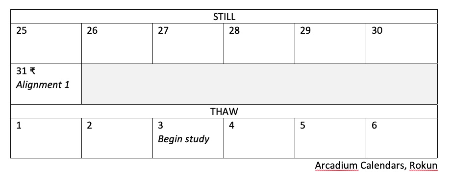 The calendar was an expensive scroll calendar, opened to the current and following week and hanging from a special mount with a pen and ink pot in a cradle on the wall next to it. This kind of calendar was not normally available to the ordinary people of the Archipelago, and was more typical of the type of calendar that might be found in a Harbourmaster’s office or a senior official’s home. It was made of solid, high-quality parchment bound carefully in a roll around high-quality staves, and carefully illuminated with high quality inks in a tasteful mixture of sepia, gold and dark reds. Every few weeks the scroll was embossed with the name of its creator, a company in Rokun called “Arcadium Calendars”. In the visible two weeks were two handwritten notes: One indicating that the 31st of Still (one week from the current date) would be an event known as “the alignment” and another indicating the 3rd Thaw was the date to “Begin study.” Unrolling it further, the Wrathbreakers found that the calendar ended in two months, at the end of the current season of Salt, and a new one would have been needed by then – perhaps, given the company was in Rokun, it had been ordered already? There was a cross on the 14th Thawing, three weeks from the current date, but no account of what that cross might mean. The only other noticeable feature of the calendar was a single strange symbol on the 31st Still, where “Alignment 1” was written. This symbol was embossed onto the calendar in the gold ink of the calendar’s makers, not written there by Anyara. Typically such symbols would be indicative of important celestial dates of relevance to the calendar’s purpose – a season’s end, for example, the likely beginning of heavy rains, a propitious time for a wedding or other special event, or a time of particular activity on the sun shard, but this symbol meant nothing to any of them. They would need to speak to the calendar company to learn its meaning.