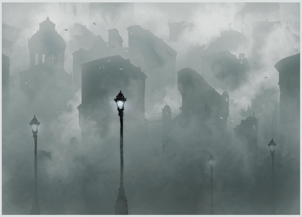 Artist note: The picture of the city in mist is by a Lithuanian artist called Gediminas Skyrius, and appears to be from an illustrated book.