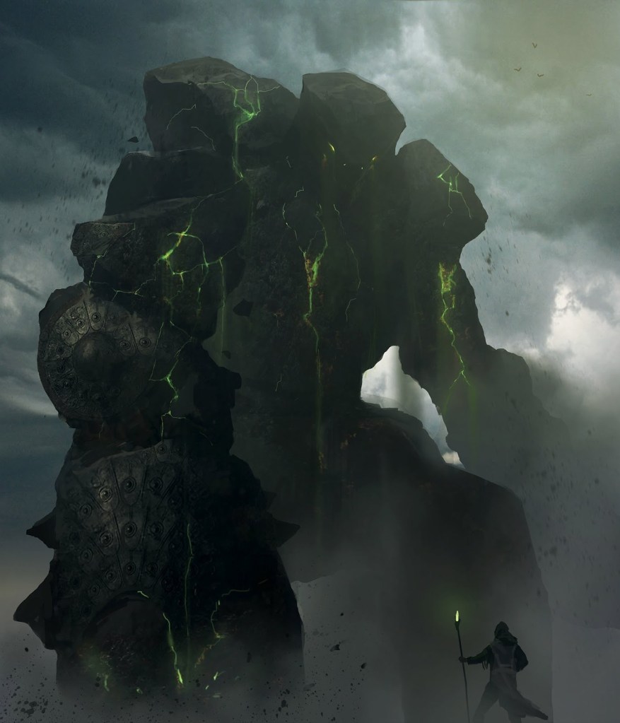 Inside was a huge, high-ceilinged room with laboratory benches lining the walls on one side, and a study table at the far end. The room towered up into shadow perhaps 20-25 m above them, and was dimly lit with just candles and a few recessed enchanted low-light globes. Opposite the laboratory benches, standing against the right hand wall, was a huge structure of scaffolds, perhaps 10m square at the base and about 15m high. Inside the scaffolding stood a huge humanoid figure made of black Orun stone. The stone glimmered faintly in the dark light, but within it lines of silver and gold flickered with magical energy, and gems studded in various parts of the beast pulsed dimly with their own internal energy. This enormous statue was only a crude humanoid form, lacking proper digits, with no face and only rudimentary eye sockets, which were not yet puissant with their own light. It loomed over them, shadowy and threatening, still silent and cold, but Itzel and Bao Tap could feel that if they did not stop this process now the thing would activate, and even in its dormant state they could tell that it carried enormous power. If that thing were to activate, it would easily kill all of them.