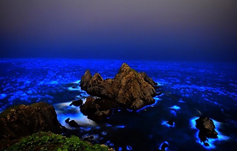 The islands are surrounded by sprawling coral reefs, which can extend up to several kilometres offshore and which glow during the night with phosphorescent light. This means that the islands are only approached at night, because the gaps between the reefs are clearly visible as pathways of shadow between the phosphorescent light of the reefs. The coral glows with a different colour depending on the position of the island in the chain. The waters of the northernmost islands glow a rich, dark bluish-purple, while the seas around the southernmost islands are flooded with a vivid red.